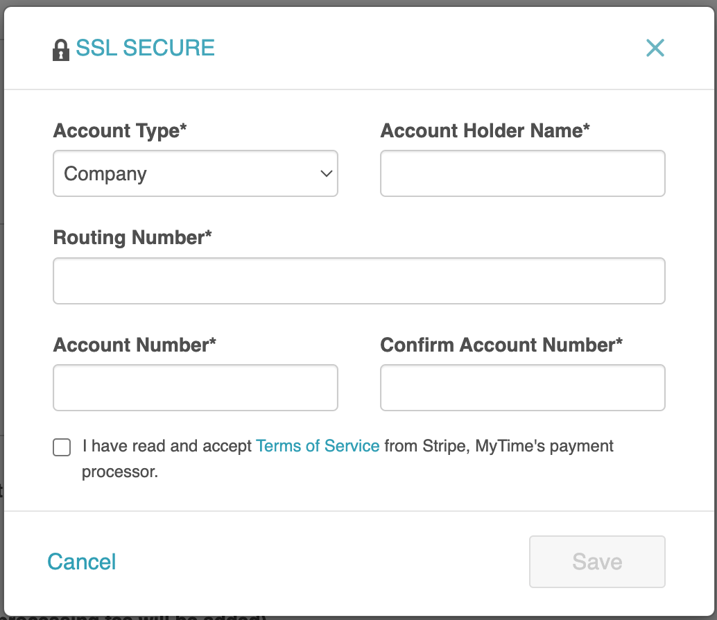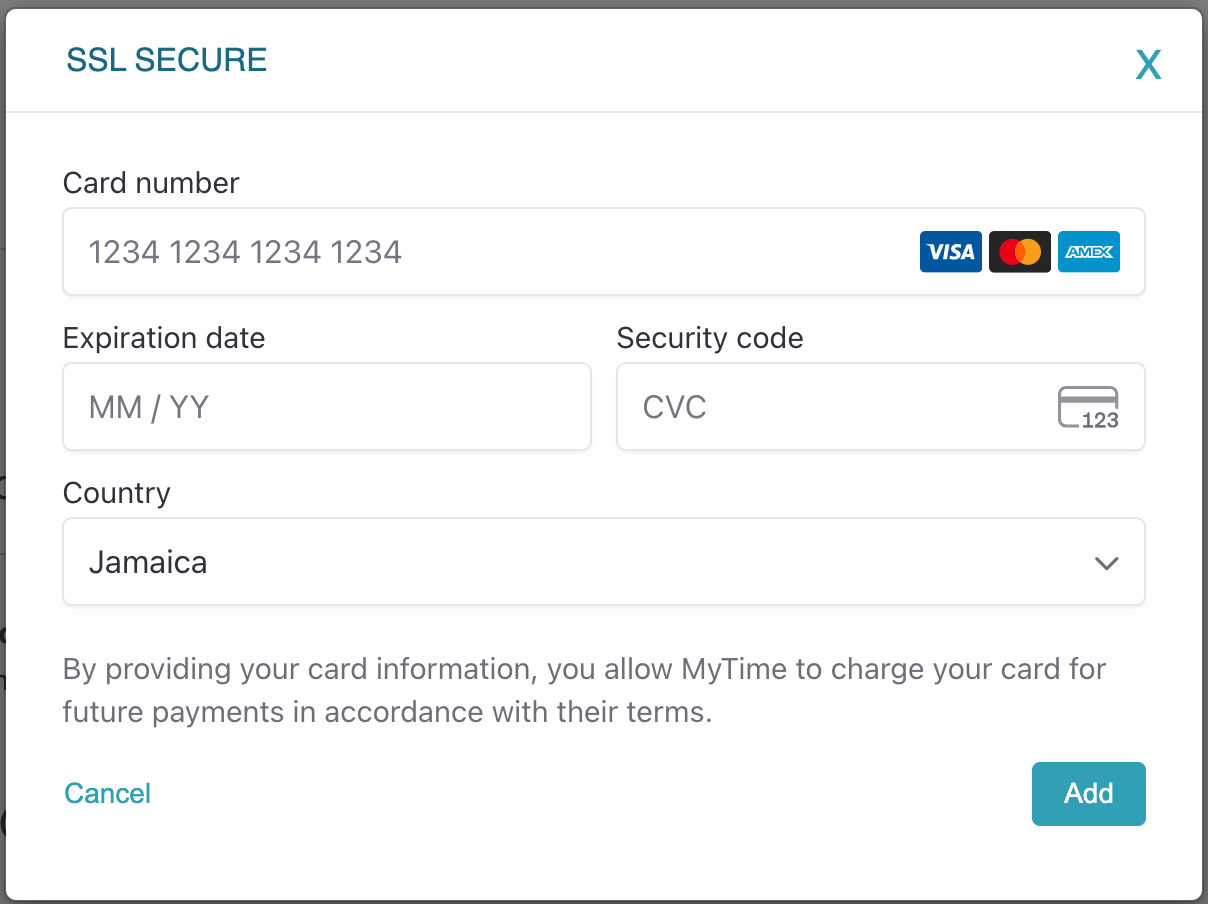 This article will explains how account owners can add a card or bank account used for subscription charges in MyTime.