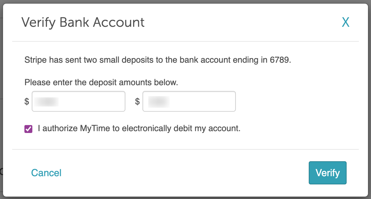 8. Enter the amounts for verification and grant permission to MyTime to electronically debit your account with charges as needed.