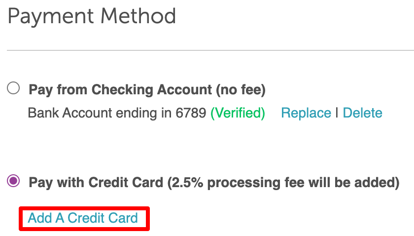3. Under Payment Method, select the radio button for Pay with Credit Card (2.5% processing fee will be added)