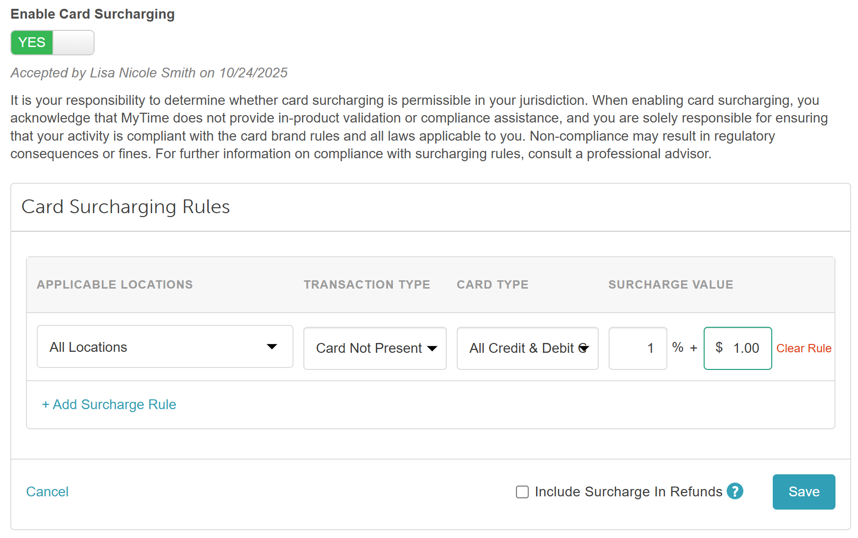 Enable Card Surcharging ![]() | This setting allows you to configure card surcharge fees. Once this setting is enabled, the logged-in staff member will be required to review and accept the terms and conditions before being able to configure any card surcharging fees. Learn more here |