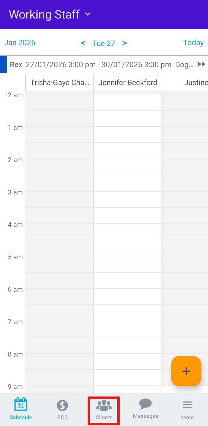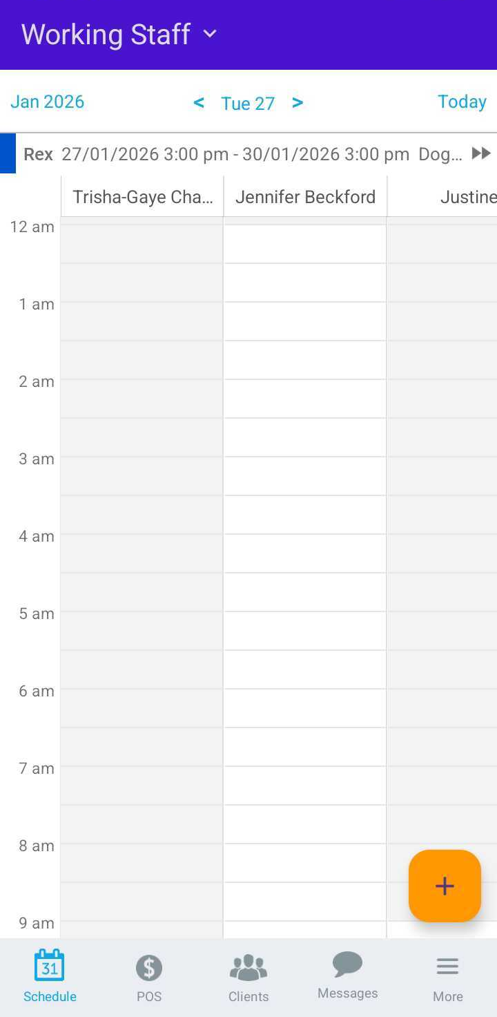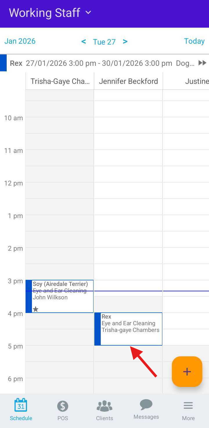 - Tap the desired time slot under the preferred staff member or tap the ( + ) icon in the bottom-right corner to open the New Event modal