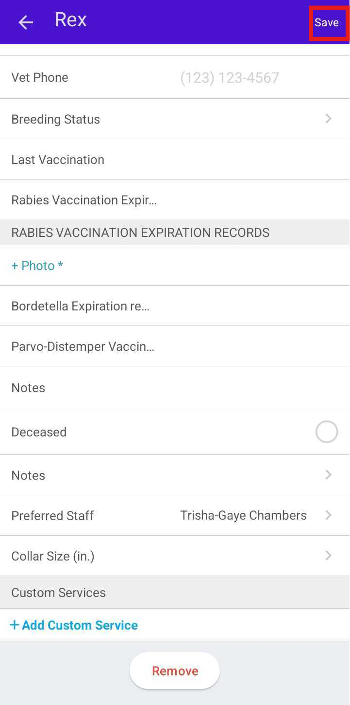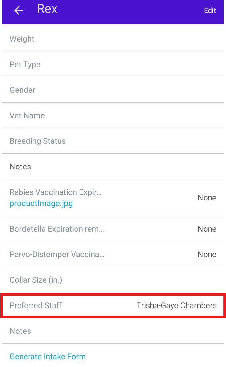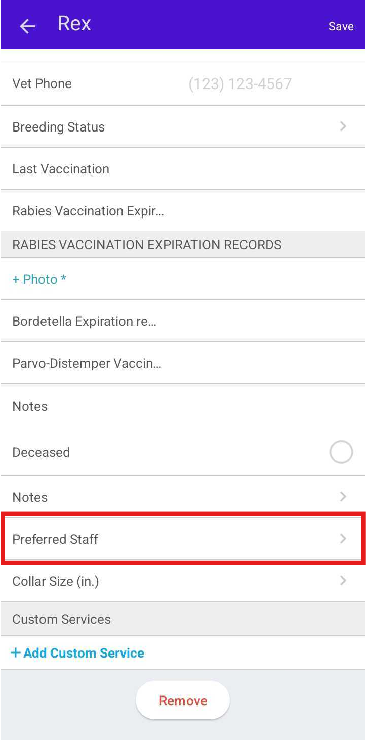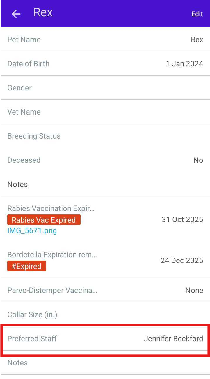 The selected staff member will now appear as Preferred on the pet’s profile