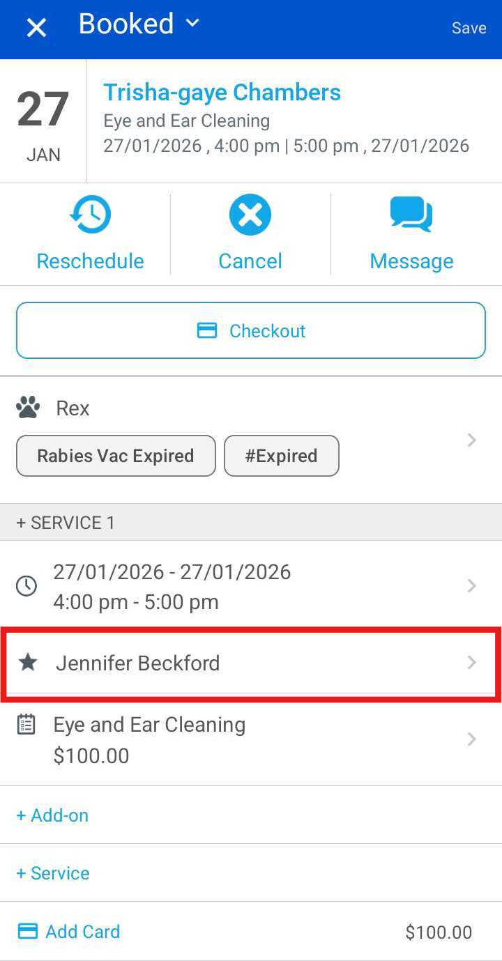 The selected staff member will automatically be saved as Preferred on the pet’s profile
