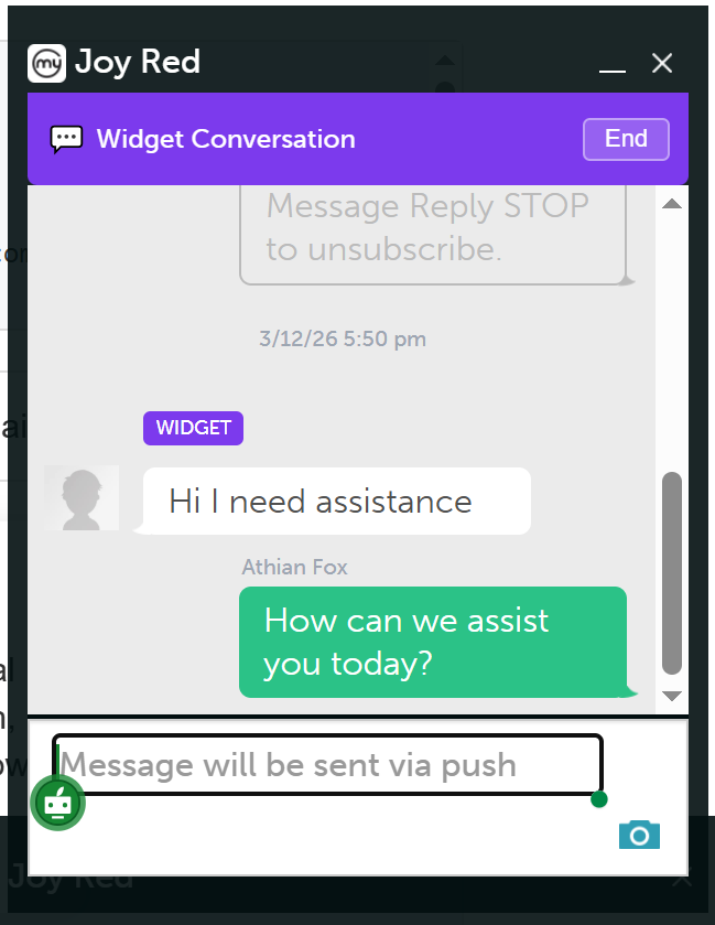 - Clicking the "X" on the widget minimizes the window but does not end the conversation.