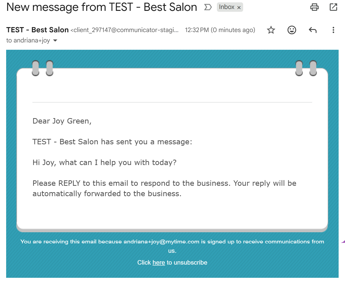 Message Received In-Store: Your team will receive an instant notification in the MyTime Communicator. New clients will have a profile automatically created to store this history.
