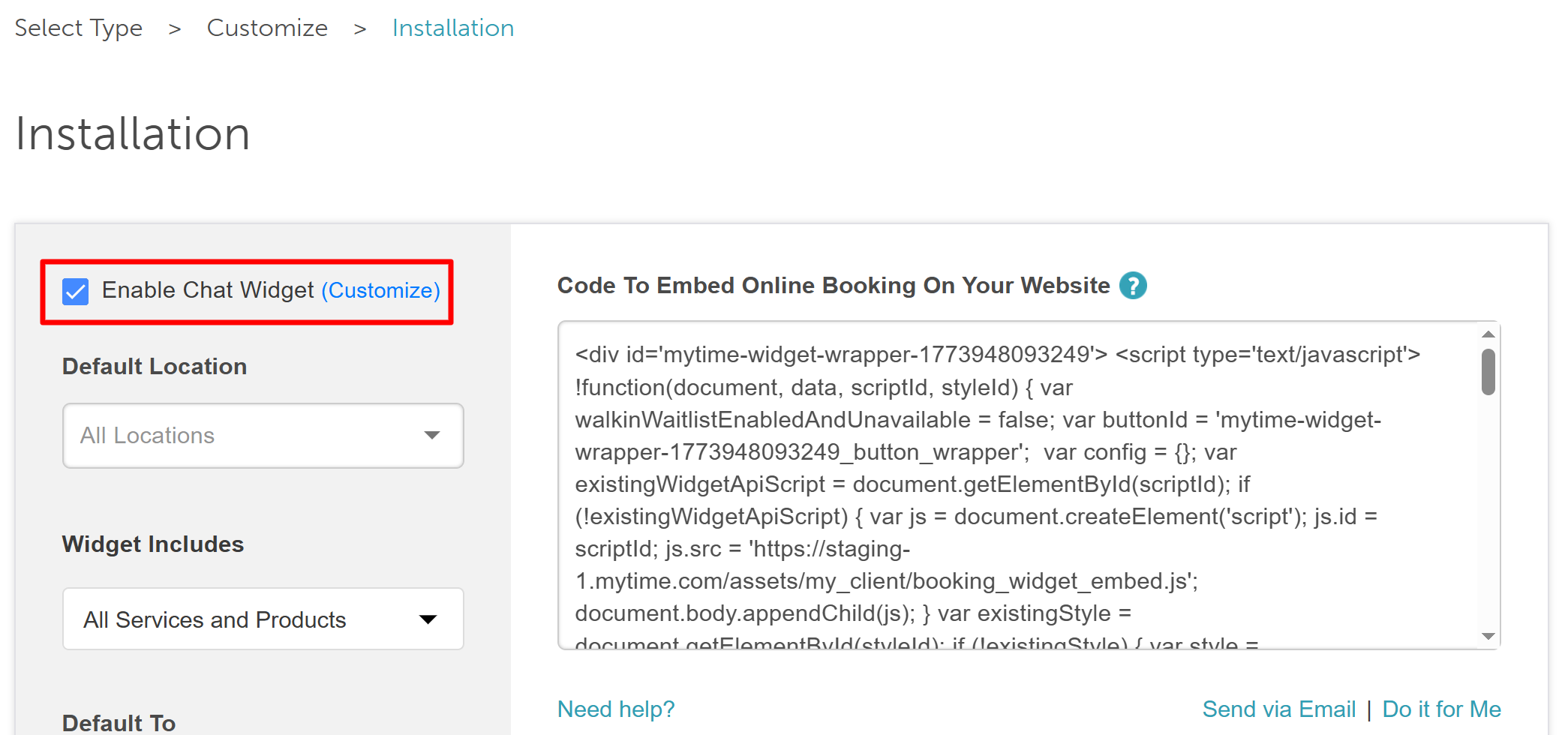 - On the installation page for either the Booking Widget or Express Checkout, locate and check the box for "Enable Chat Widget."