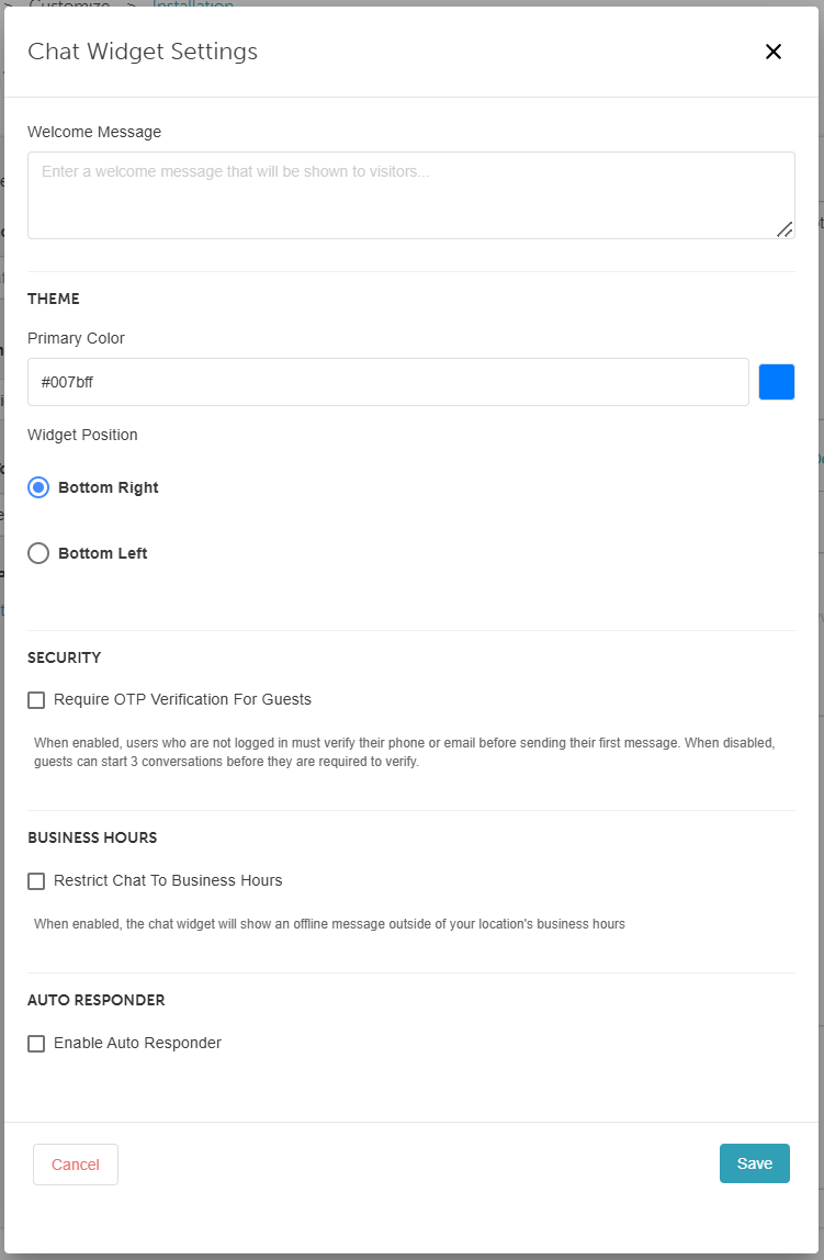 - Security (OTP): Check "Require OTP Verification for Guests" to force non-logged-in users to verify their phone or email before their first message. If left unchecked, guests can send up to 3 messages before verification is required.