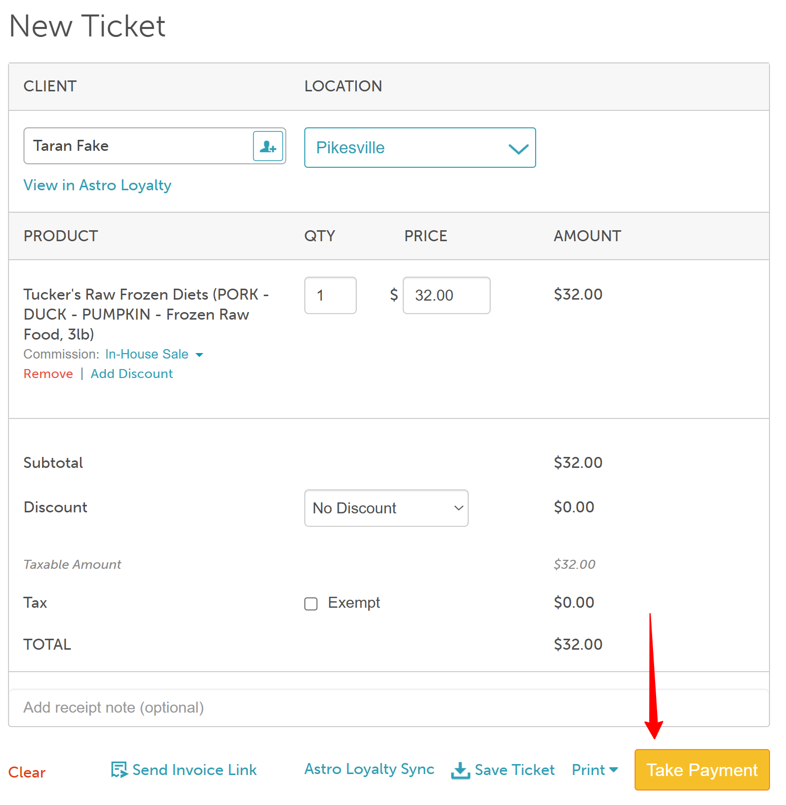 Requirements: You must have an active Astro Loyalty plan. For franchise organizations, Astro is configured at the child account level. Learn more about Astro Loyalty plans here. - POS Workflow: When a product is added to a POS ticket, an Astro Loyalty link appears. Clicking this opens the Astro Loyalty checkout page in a new tab, automatically transferring client info, items, and totals.