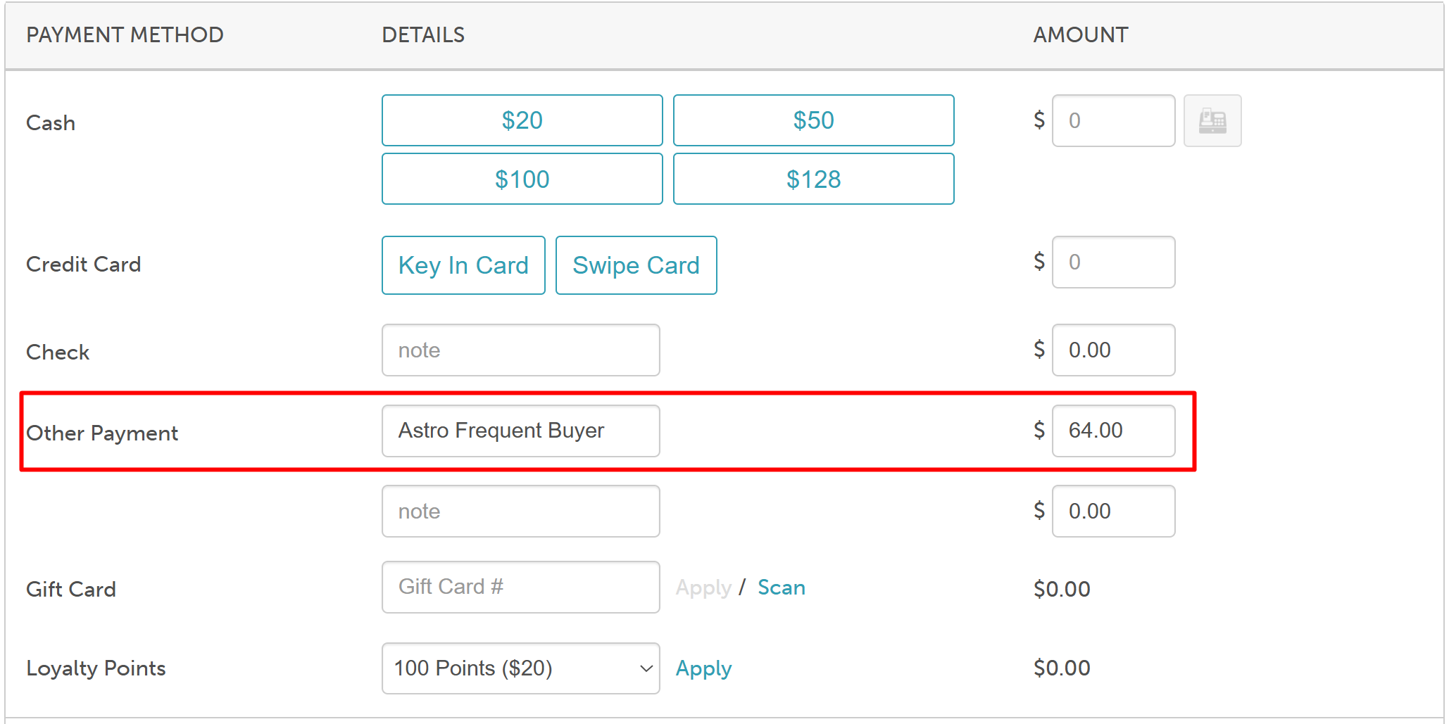 - Astro Loyalty Sync: Refreshes the page. If the client has available points, they will appear under the Other Payment section.