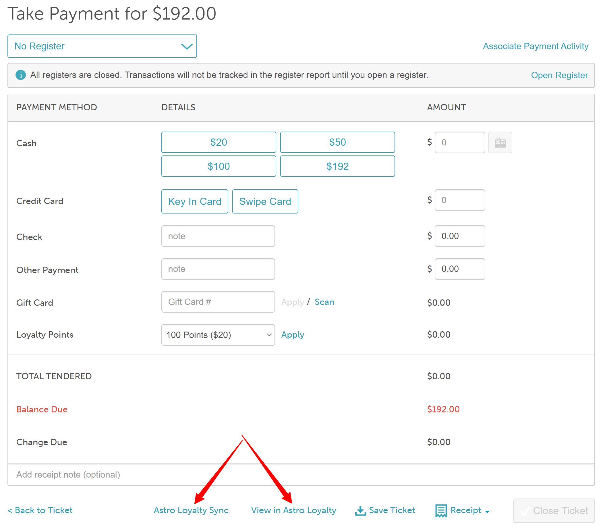 - Once the hidden setting is active, you must enable the "Apply Astro Loyalty Redemptions Post-Tax" company setting to see Astro as a payment option on the Take Payment page.