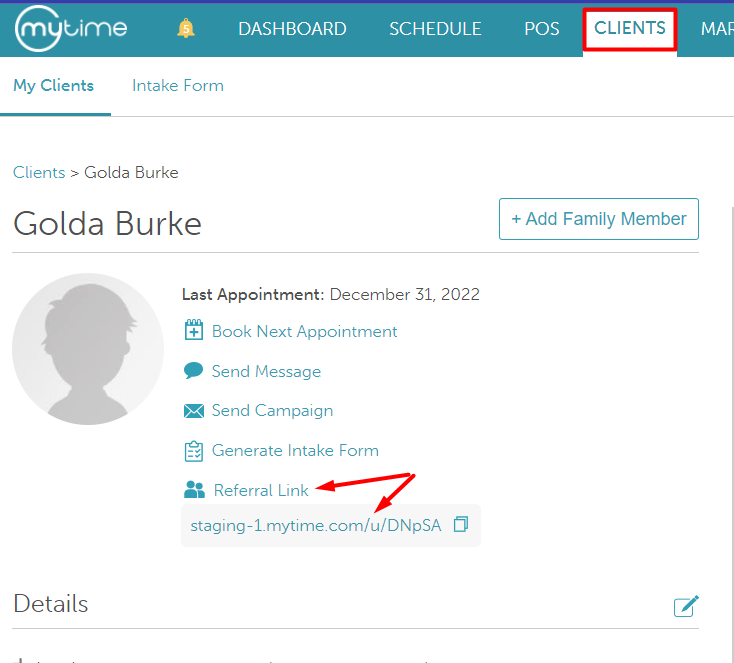 Each client in MyTime is assigned a unique referral link, which can be accessed directly from their profile. You can provide clients with their referral link to share with friends and family and help promote your business.