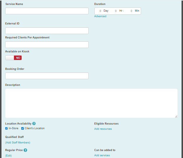- Service Pricing & Duration Same for all Locations and Staff Members
