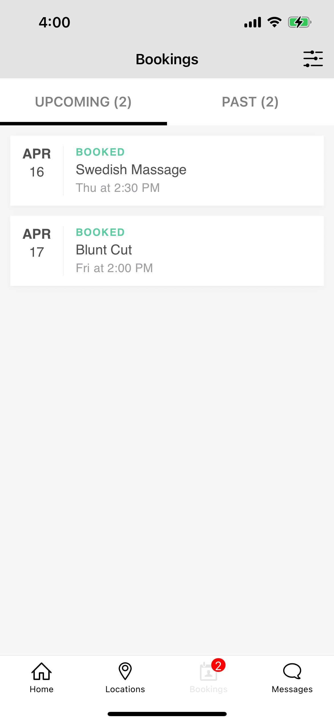 The bookings page will present a comprehensive view of both past and upcoming appointments and classes. Each entry will include the date and time of the appointment, the appointment status, and the name of the corresponding service or class.