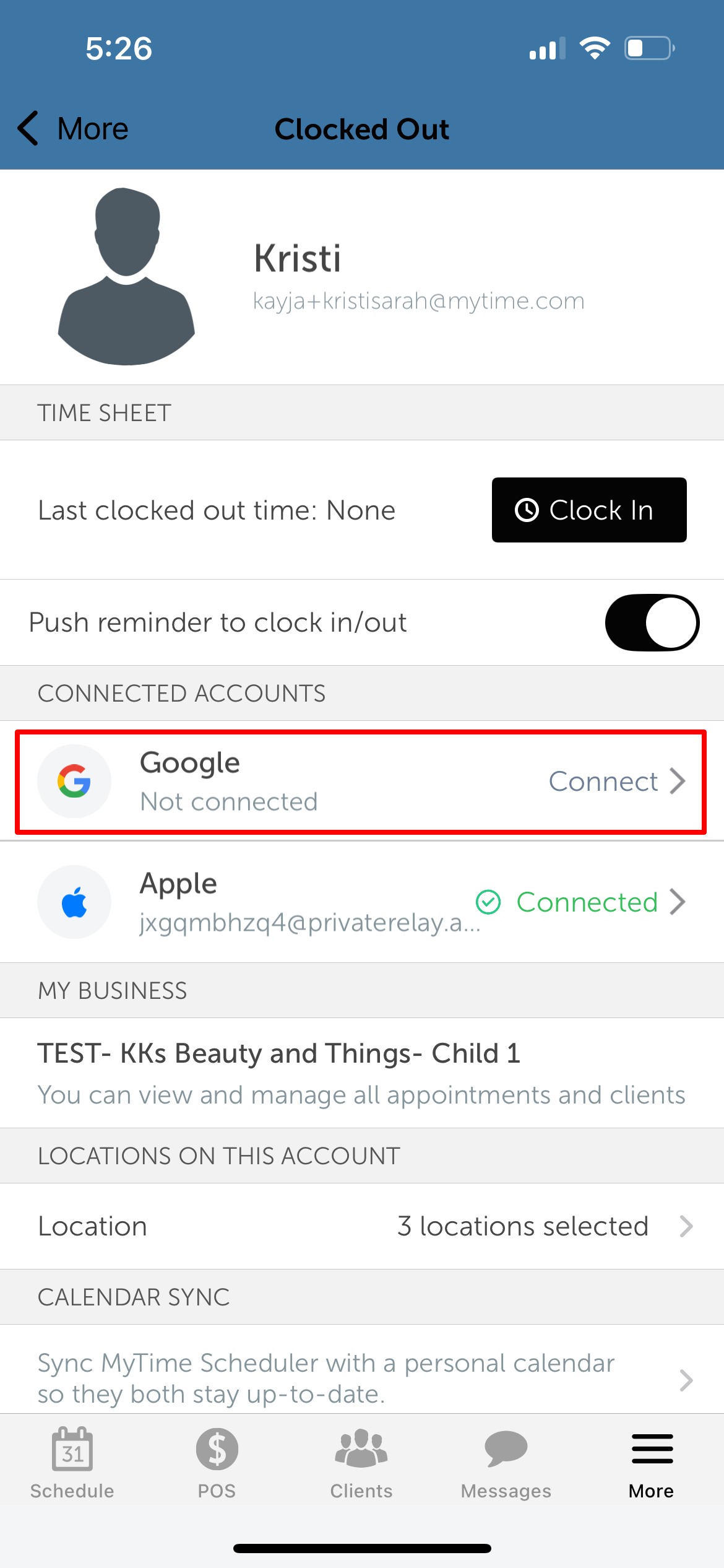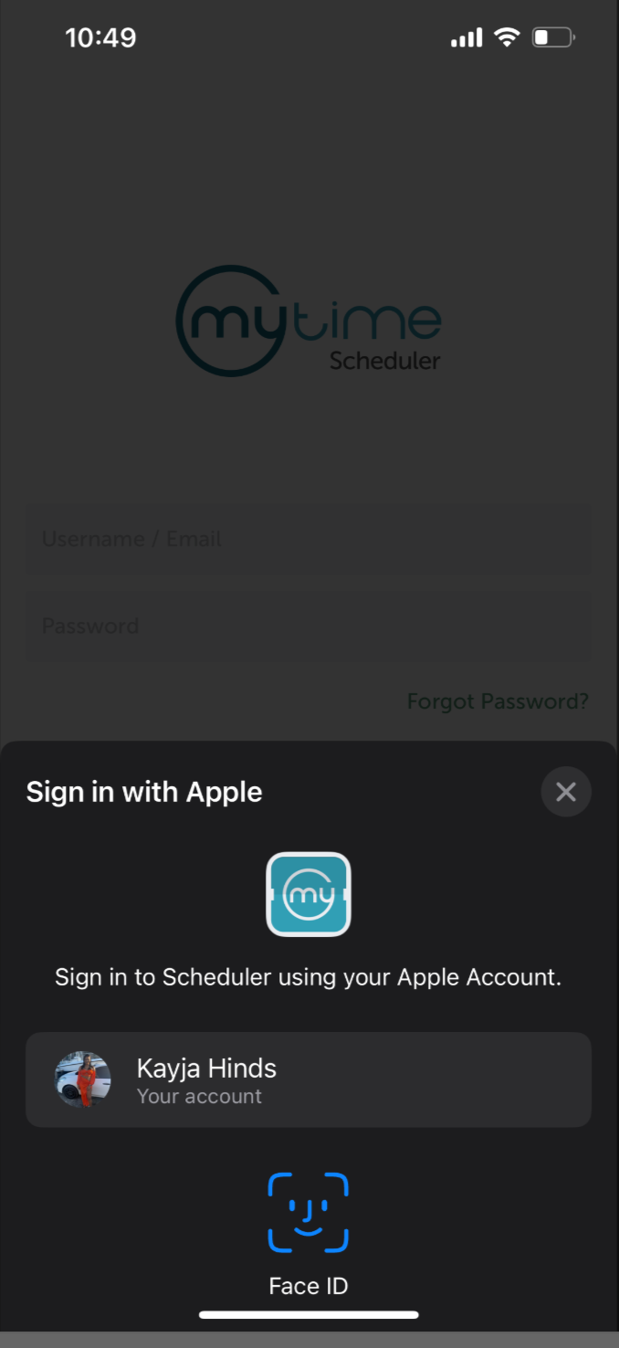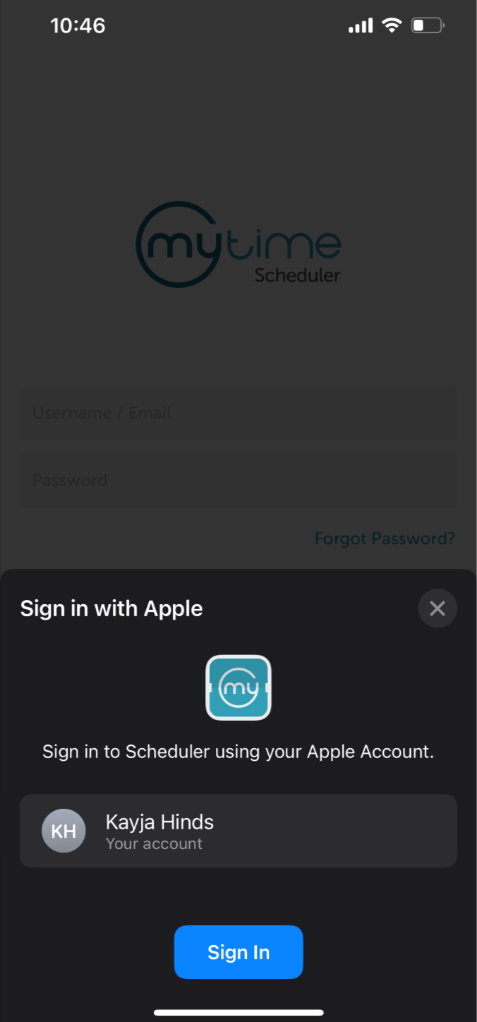 - The system automatically links to the correct staff profile by matching the email address on their Google or Apple account with the one on file in MyTime. Once connected, staff and owners can sign in anytime by simply selecting their preferred option — a secure, frictionless start to every shift.