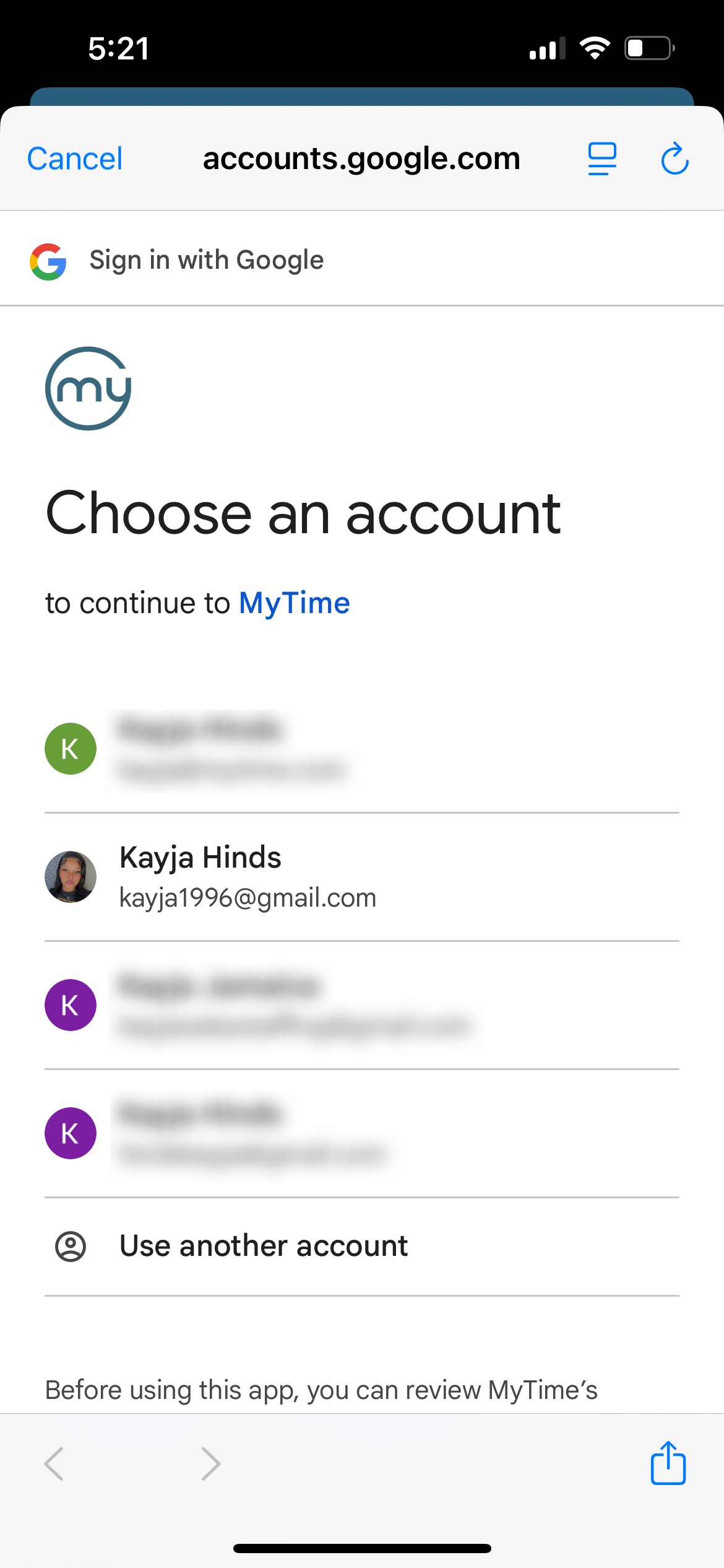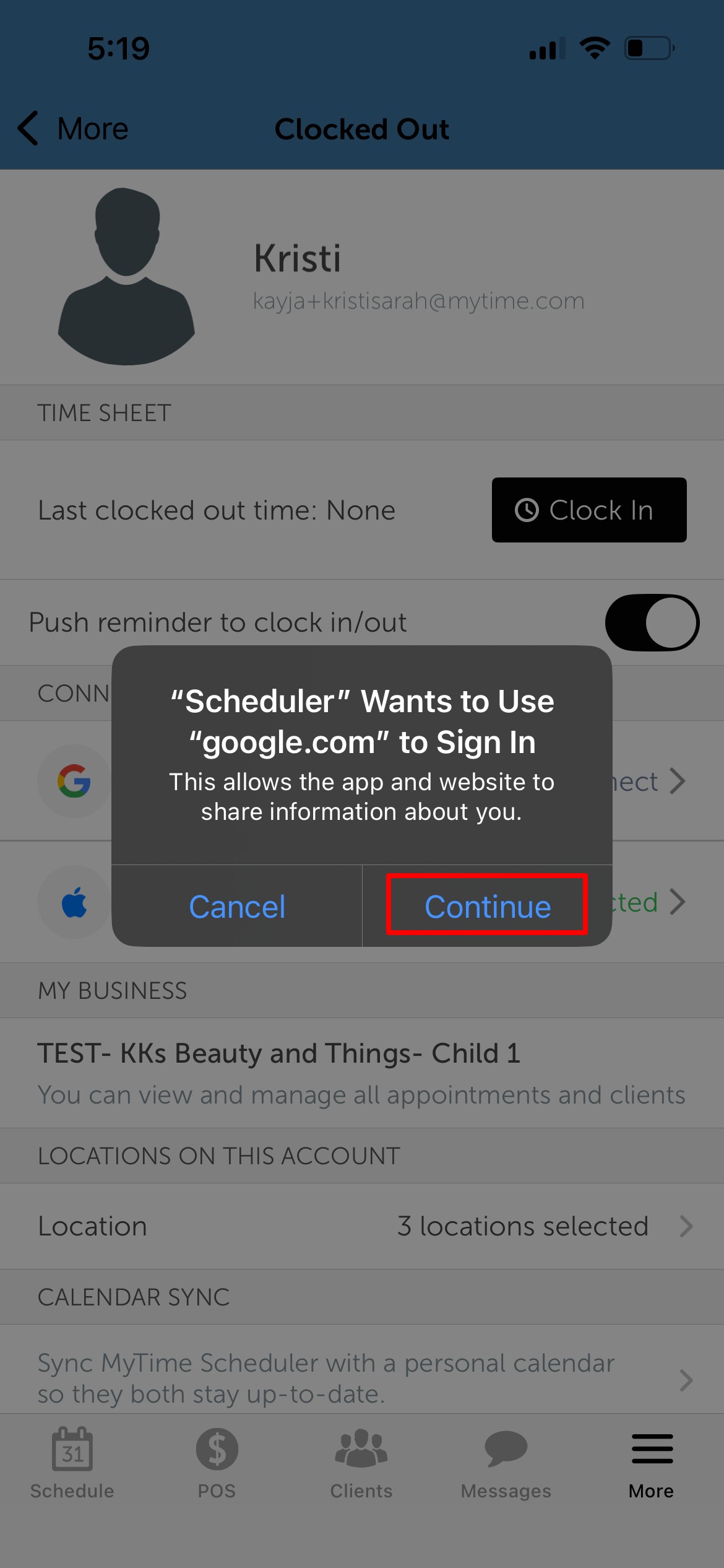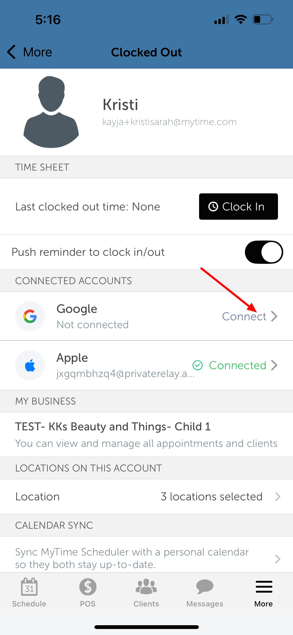 - The system automatically links to the correct staff profile by matching the email address on their Google or Apple account with the one on file in MyTime. Once connected, staff and owners can sign in anytime by simply selecting their preferred option — a secure, frictionless start to every shift.
