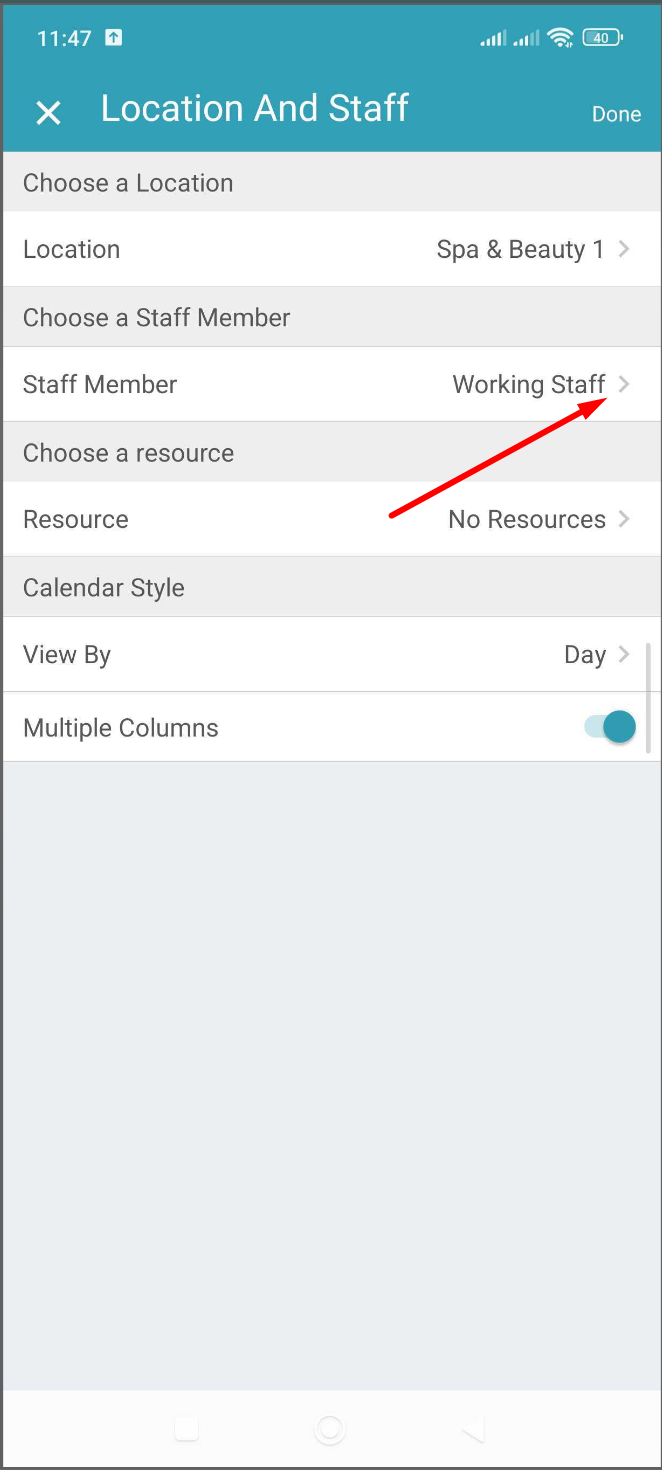 - Select a staff member by tapping the "Staff member" option