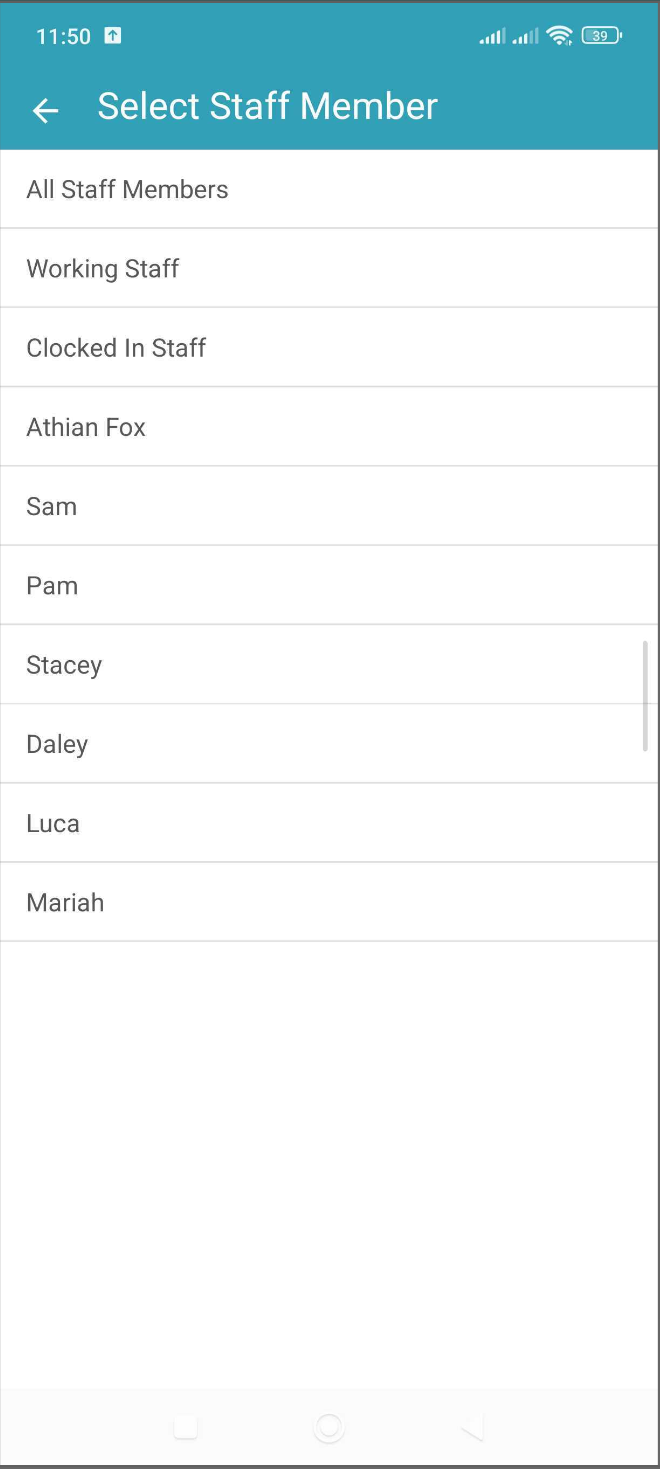 - You have the option to select from the following: all staff members, working staff, clocked-in staff members, or the name of a specific staff member