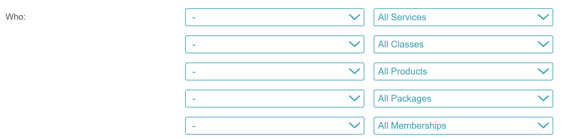 You can target clients based on whether they have or have not received specific services, classes, products, memberships, or packages. Below are examples of how each configuration works:
