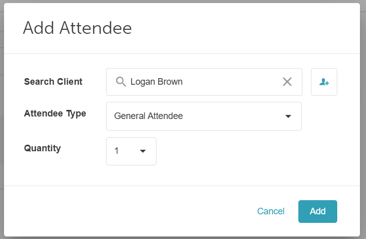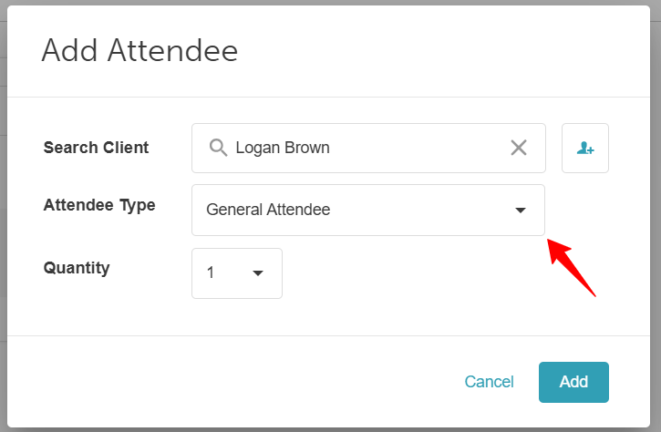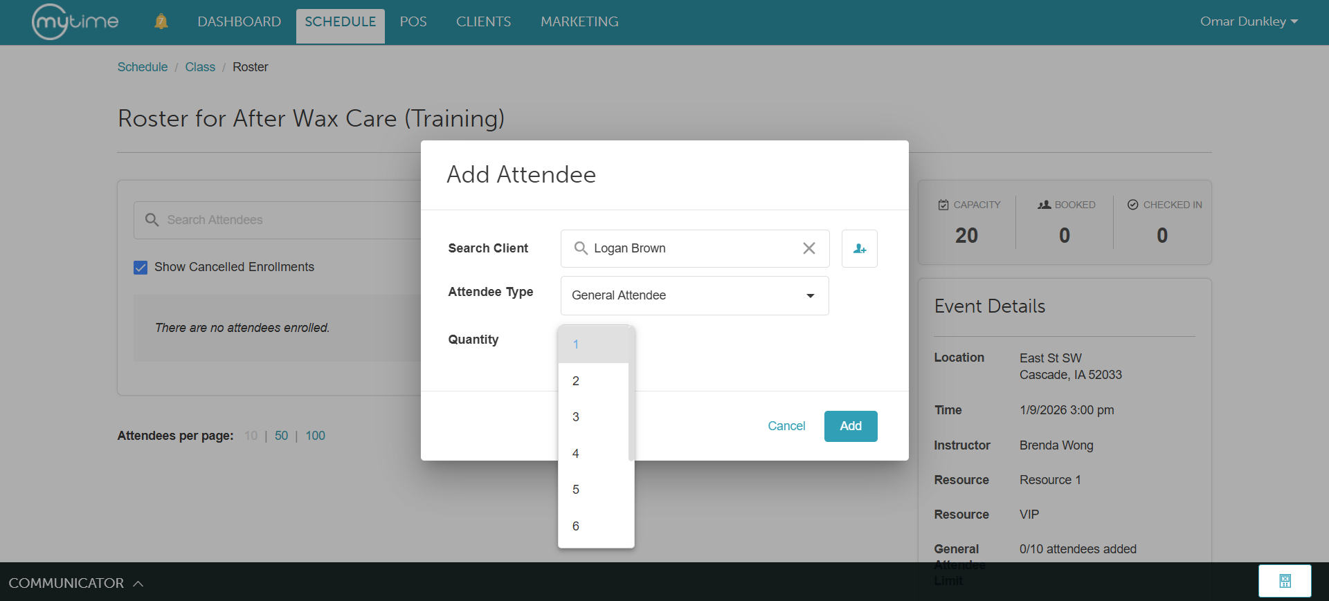 - If the "Allow Selecting Session Enrollment Attendee Quantity on Roster Page” setting is enabled, use the Quantity field to choose how many spots the client would like to book for that attendee type.