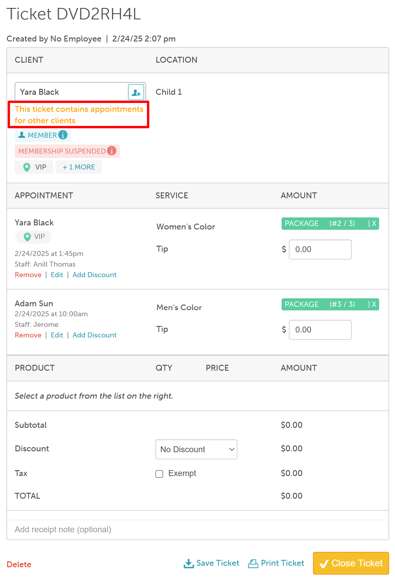 - If multiple clients are included on a ticket, the system will display, "This ticket contains appointments for other clients."