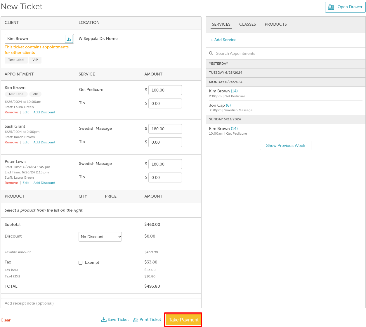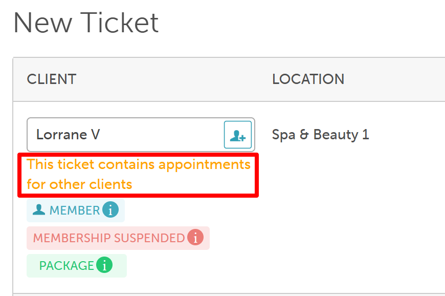 - Once multiple clients have been added, a "This ticket contains appointments for other clients" message will appear