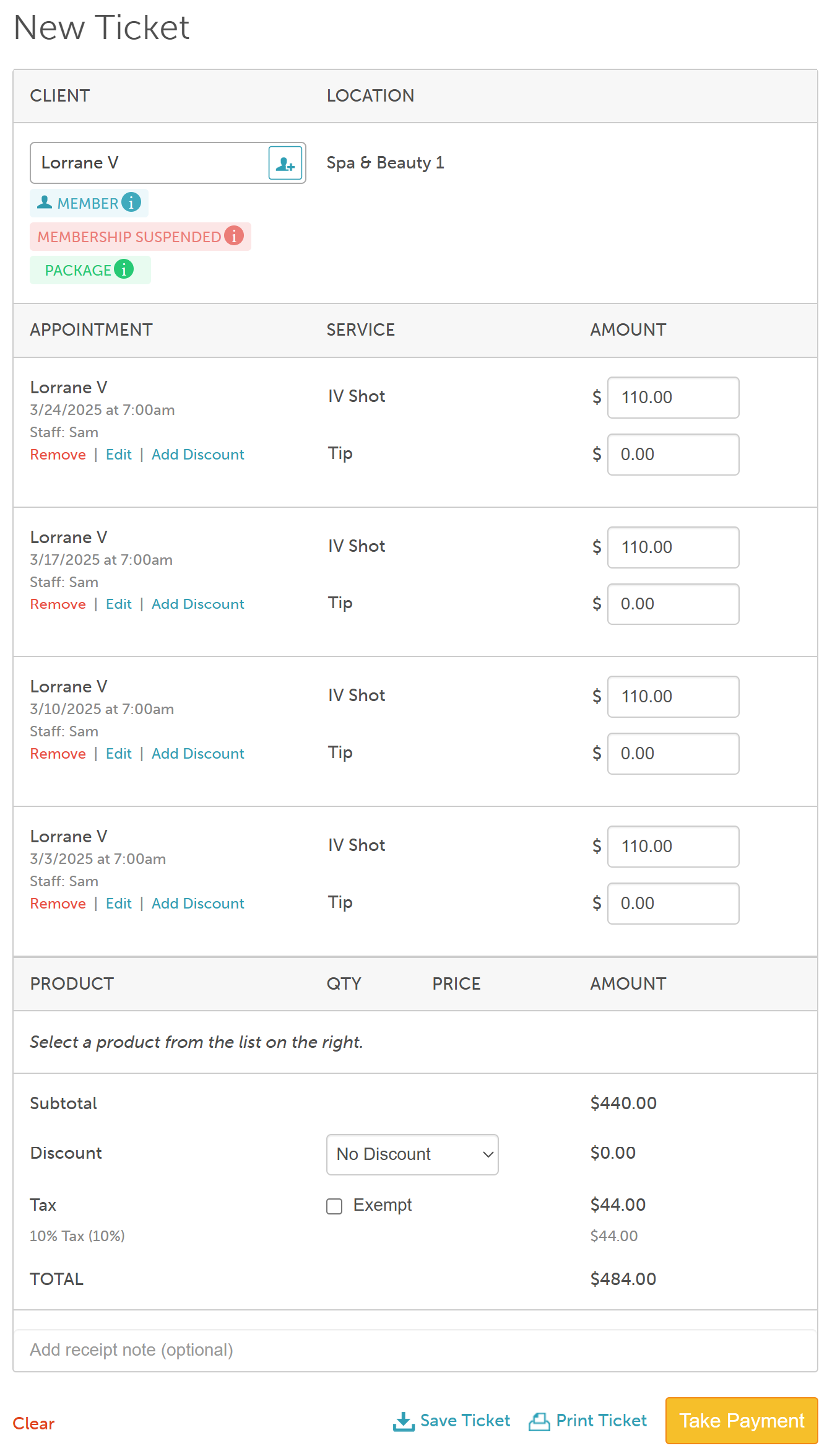 - The first selected client’s name will appear in the Client section of the ticket. To apply membership or package credits across all appointments, the first client must have an active package or membership