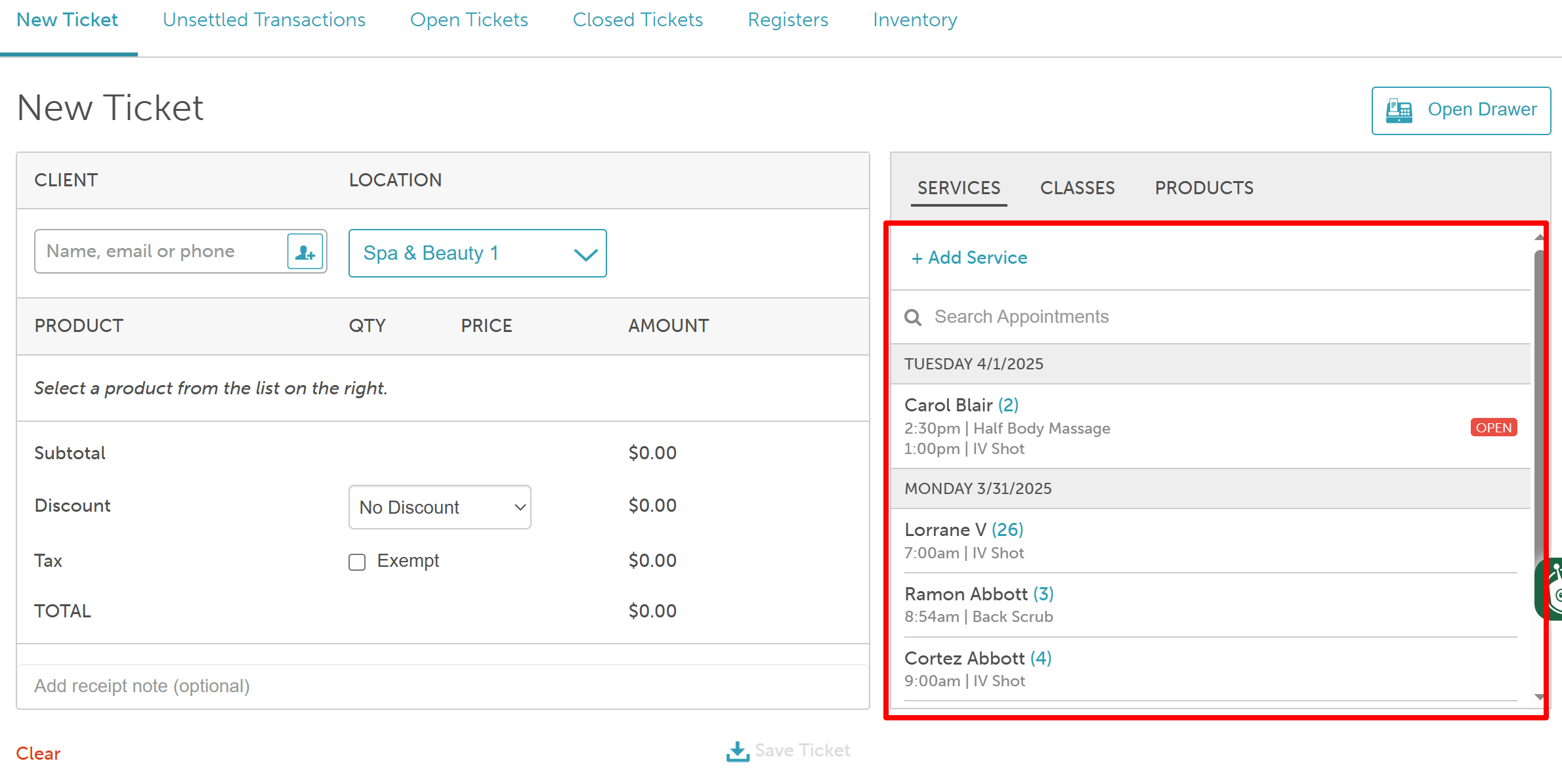 In POS, you can combine unpaid appointments into a single ticket—whether they belong to one client with multiple appointments or multiple clients with unpaid appointments. This lets you process payment for all appointments in one transaction.