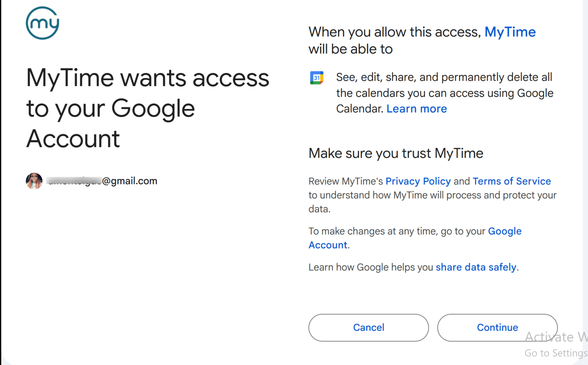 - Grant MyTime access to your Google Calendar