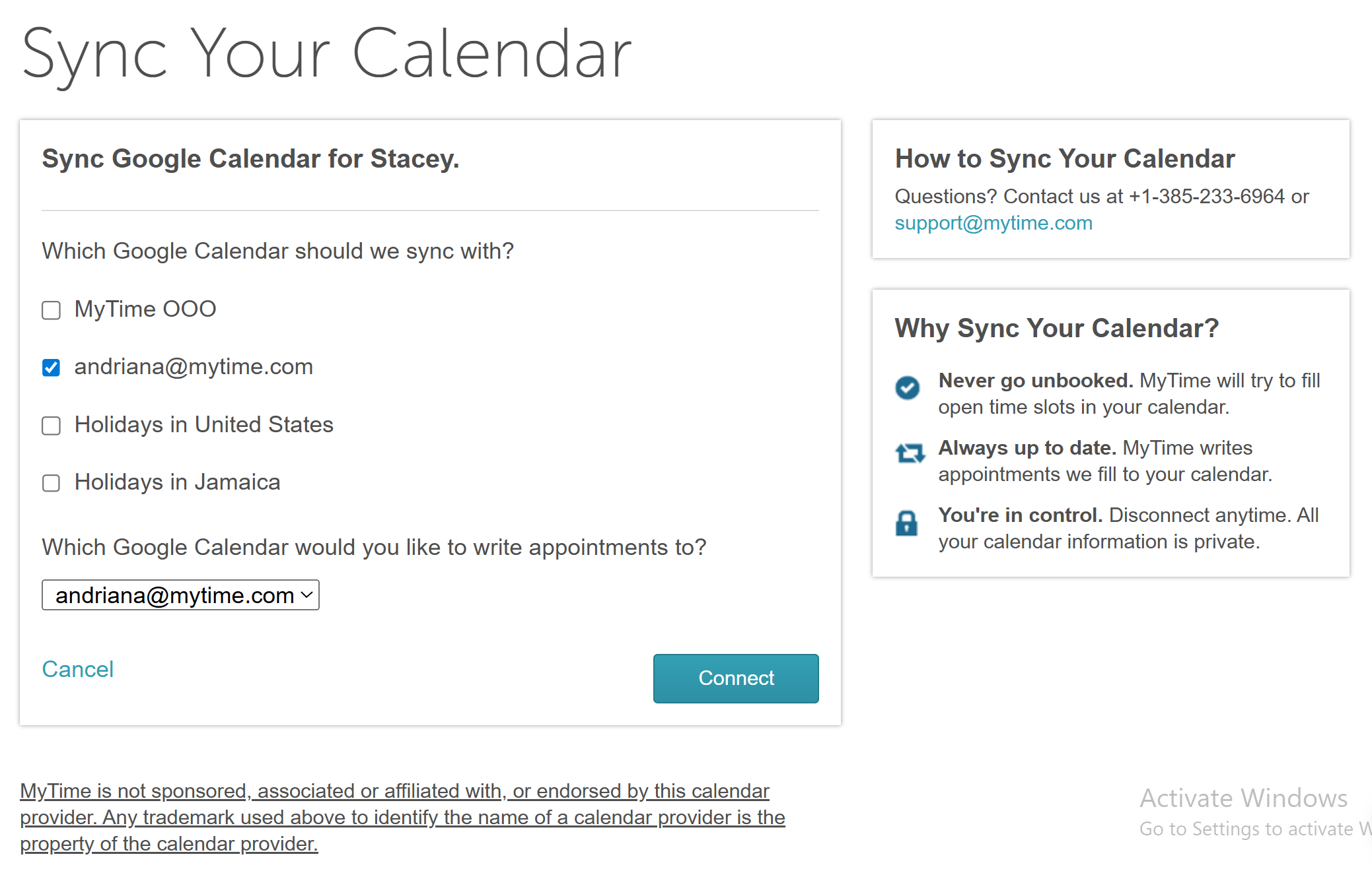 - Select the Google Calendar where MyTime appointments should appear