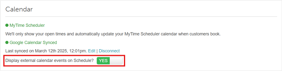 - Ensure that "Display external calendar events on Schedule" is toggled to YES (as shown below).