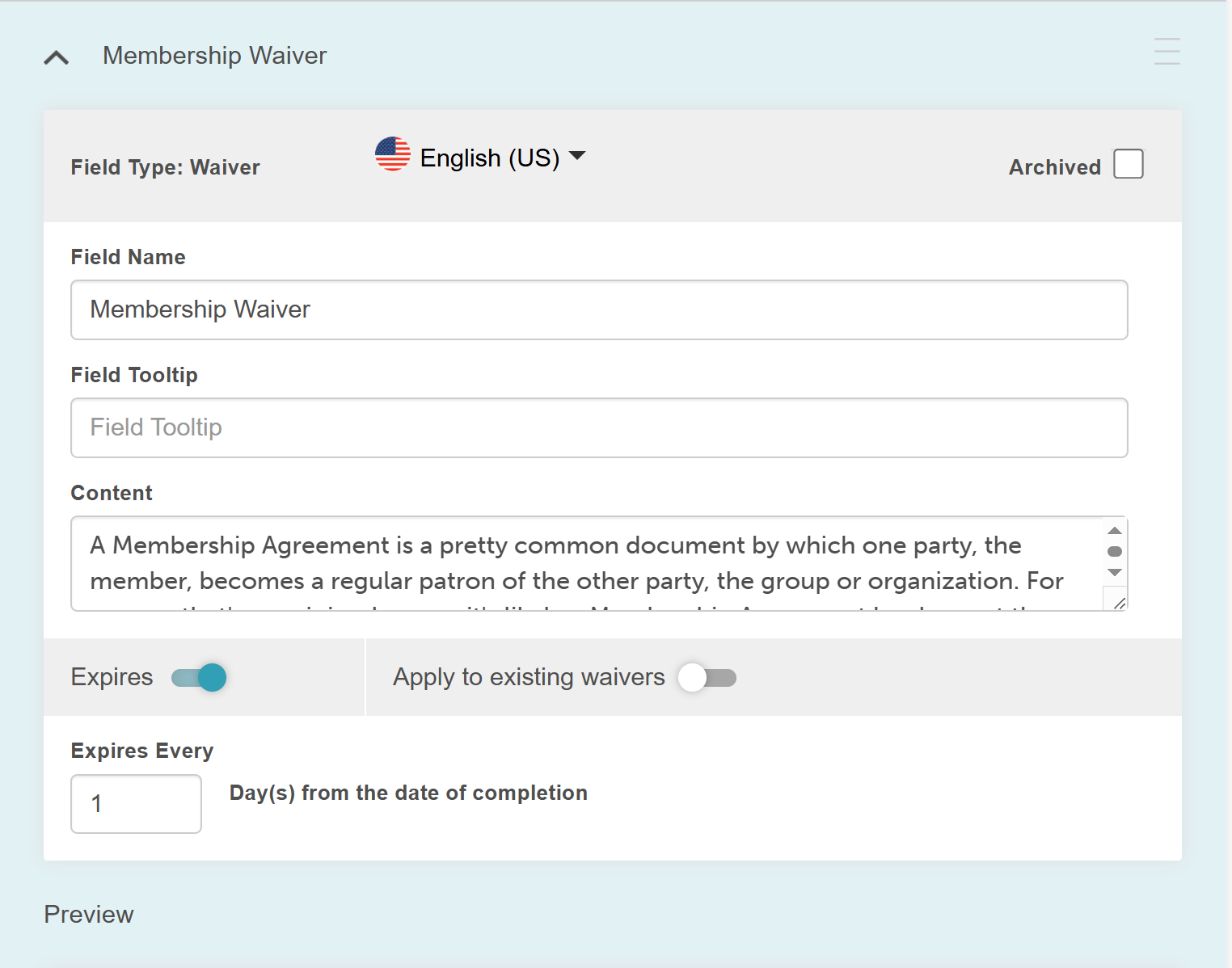 - An expiration input will appear. Enter the number of days the waiver should be valid.