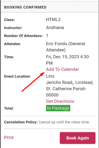 - Use the Book Again button to navigate to the class schedule page to book another class session