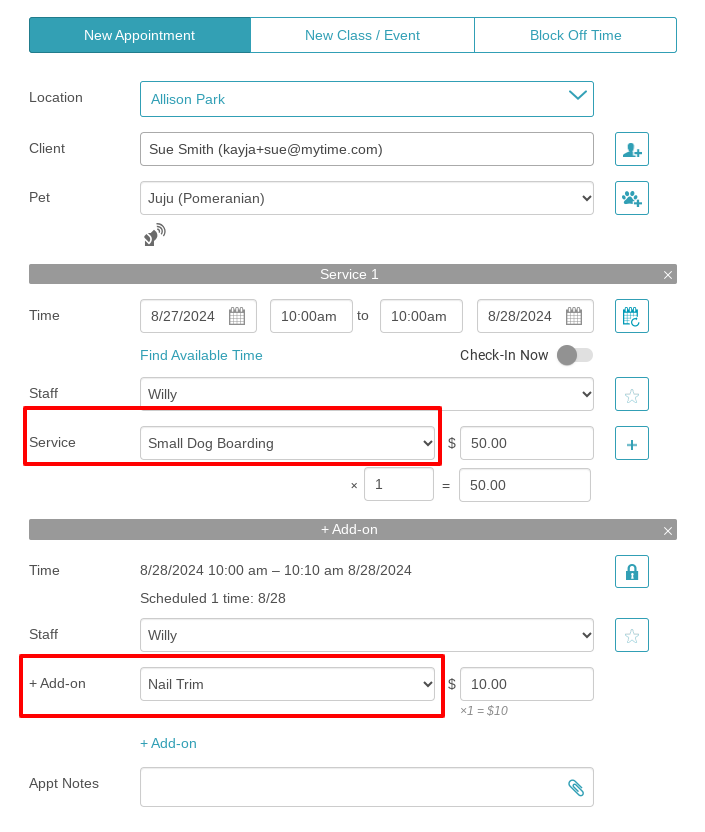 - Scheduling add-ons within a multi-day service requires a hidden setting that can only be enabled by the MyTime team. To activate it, contact support@mytime.com
