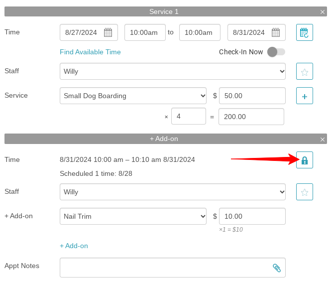 - When an add-on is locked to a core service, its start time automatically follows the core service’s end time. Once unlocked, the add-on can be scheduled on any date within the multi-day service.