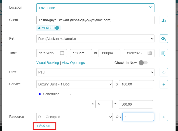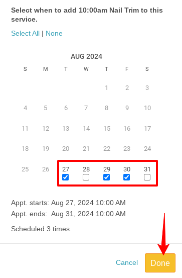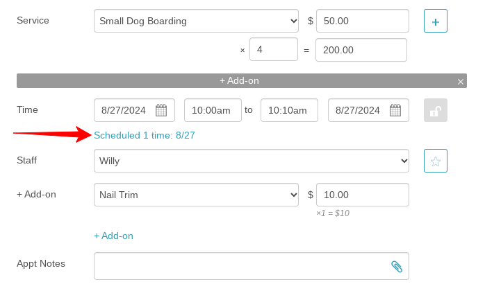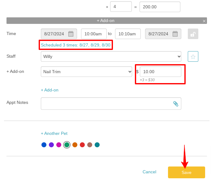 - The add-on multiplier will update automatically based on the number of selected dates. Click Save in the appointment modal