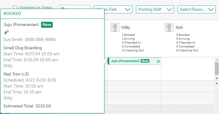 - Hovering over the appointment on the schedule will show the core service and grouped add-ons with their durations