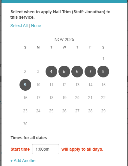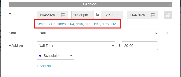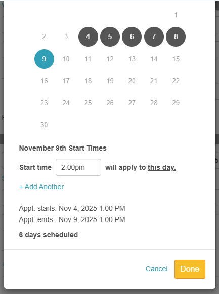 - You can assign different start times for the add-on on different days. Example: If a core service runs from August 1–5, you can schedule the add-on for 2:00 PM on August 2, 10:00 AM on August 3, and 4:30 PM on August 5, all within the same multi-day appointment.