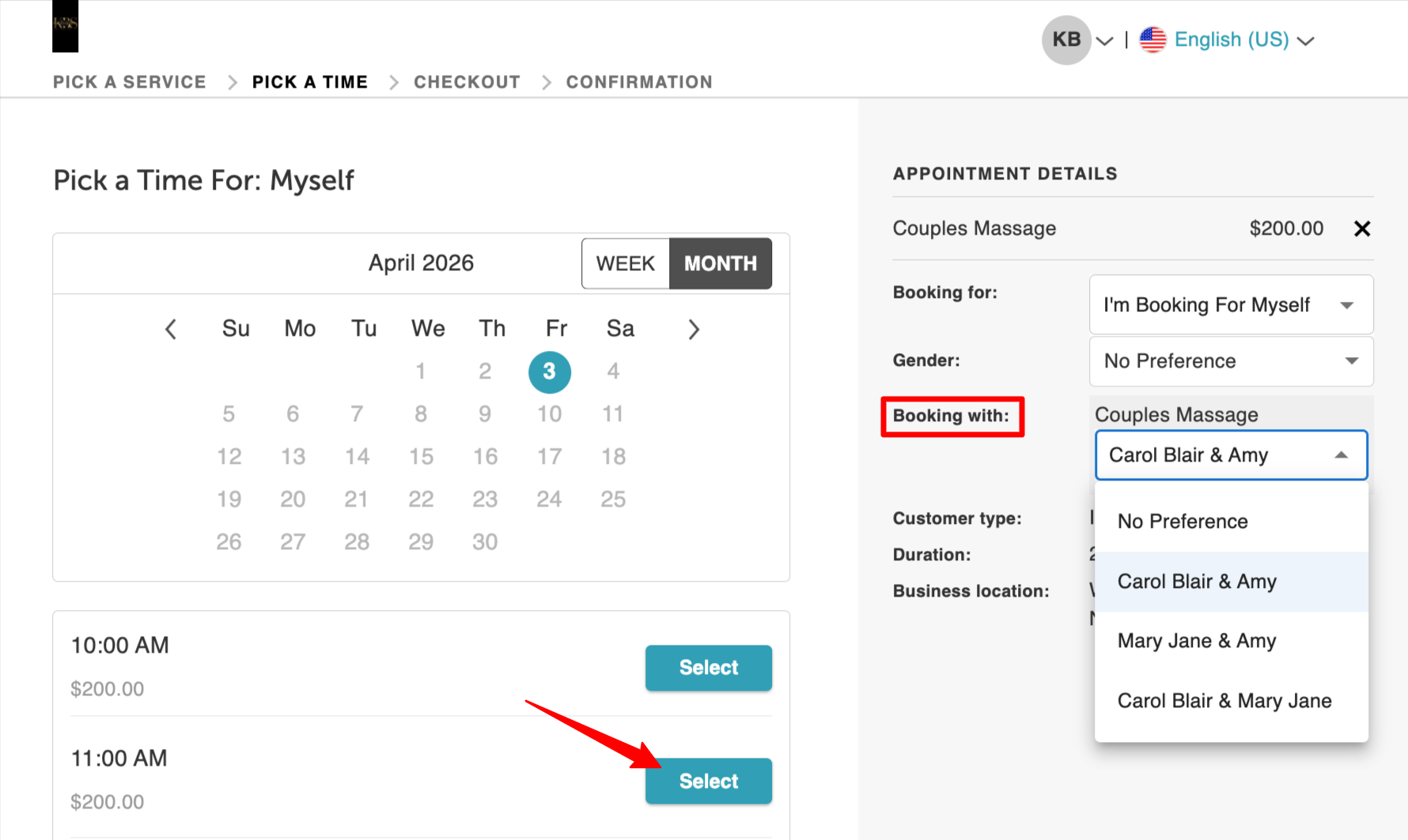 - From the 'Booking ith' dropdown, select the staff members who will perform the service
