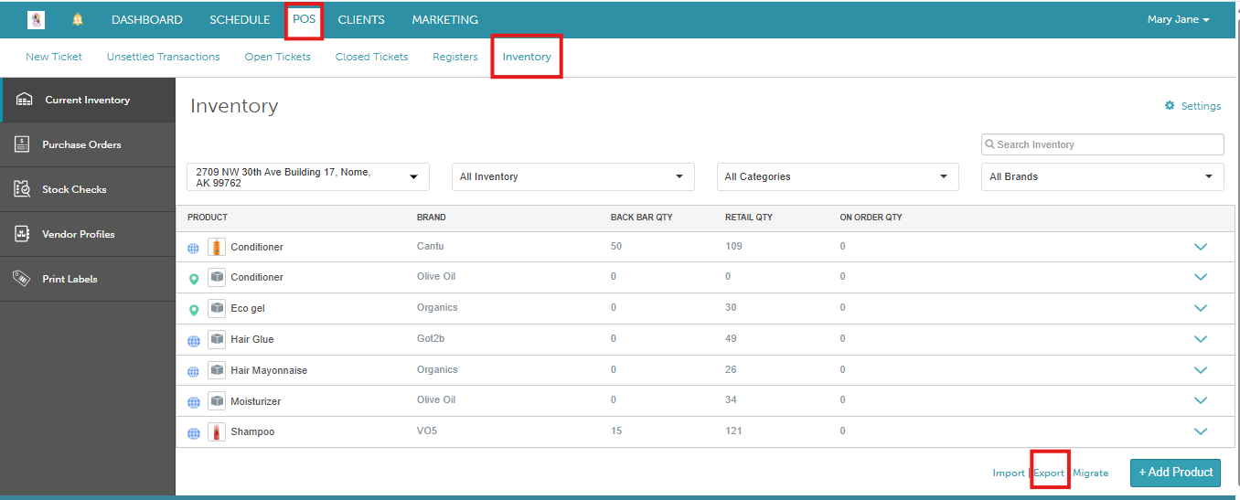 - A spreadsheet titled Inventory from {the location name and date} will be downloaded. Click on the exported file to open the spreadsheet