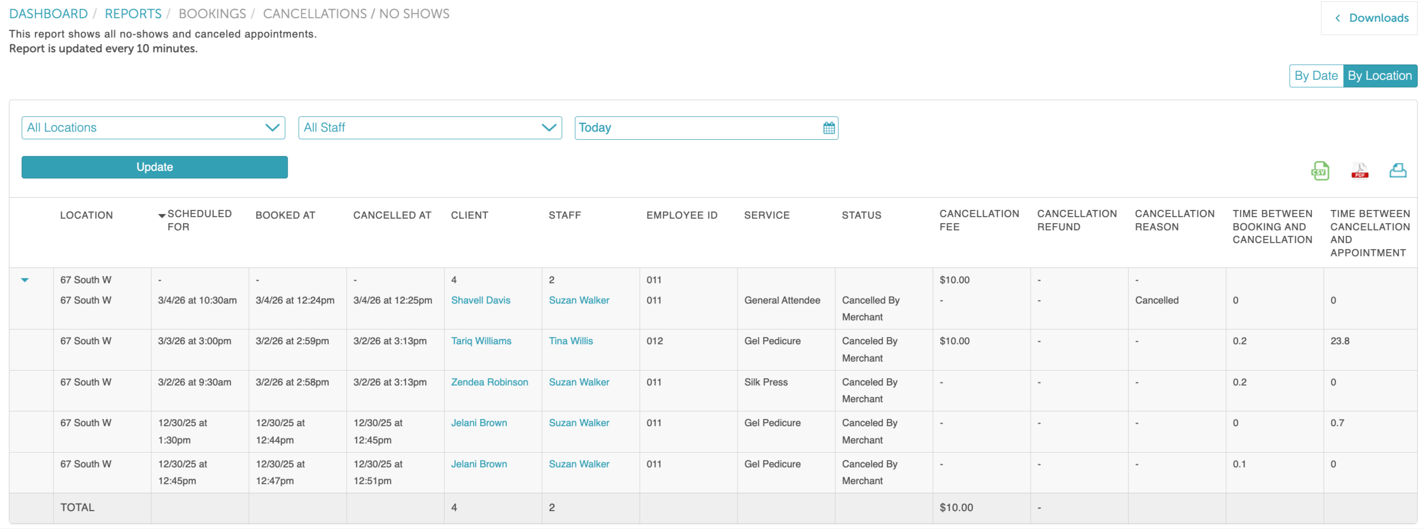 Below the By Location button, you have the option to export the report as a CSV, PDF, or print version. Once you have selected your filters, click on the UPDATE button to generate the desired data.