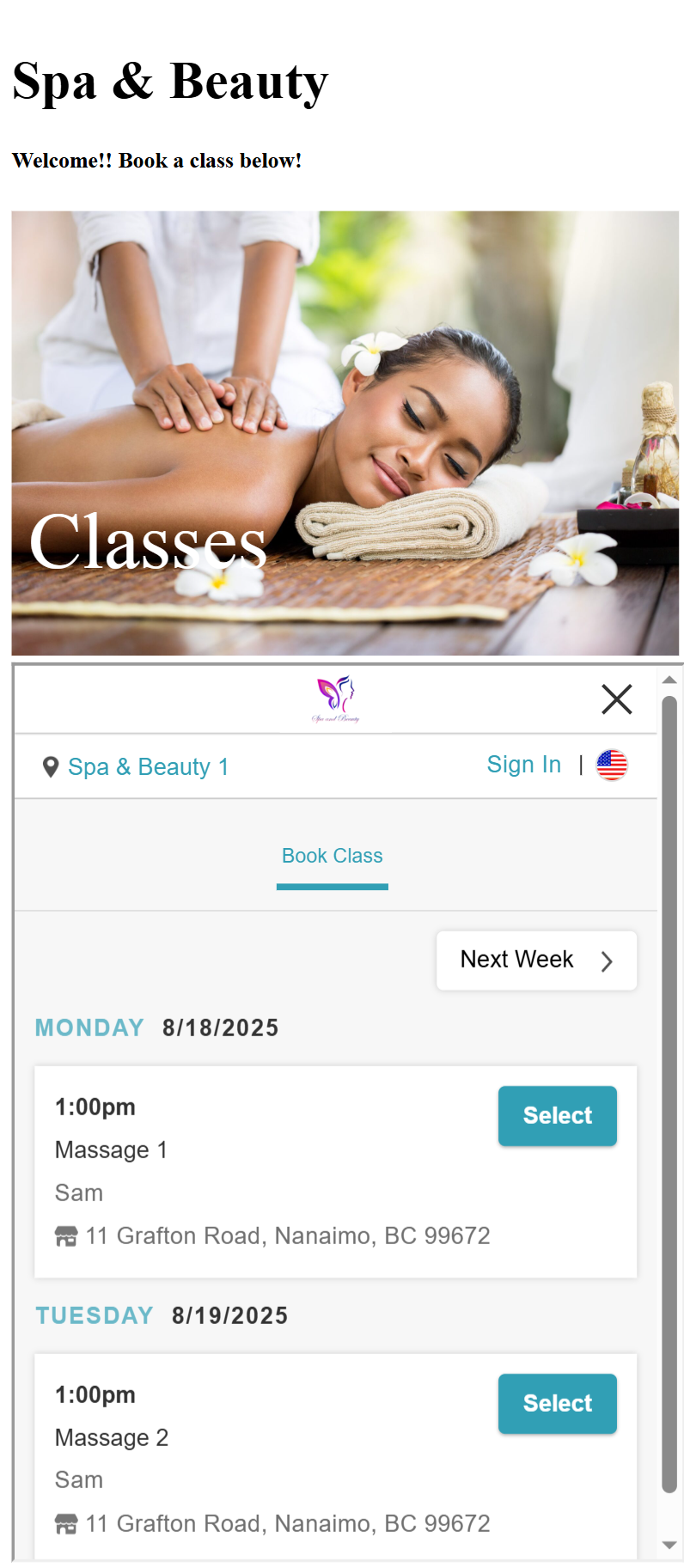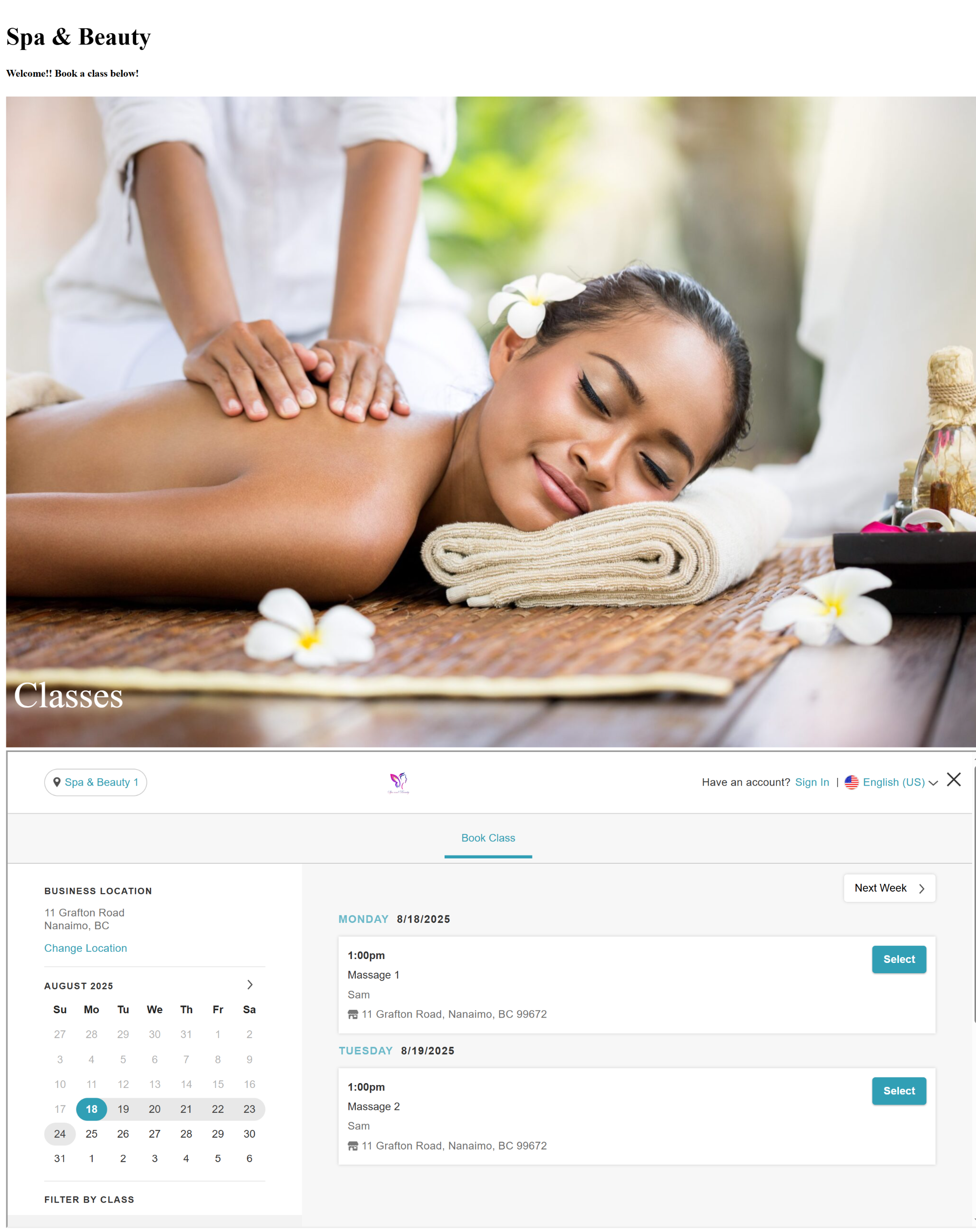 Once configured, your class bookings can be embedded on your website as a button or an entire page without a pop-up.