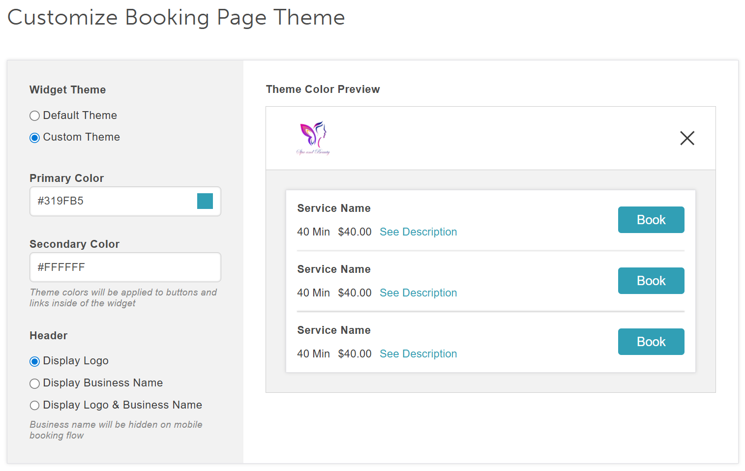 - Scroll down to the "Customize Booking Page Theme" section to adjust widget themes and specify what should be displayed in the header when booking a class online