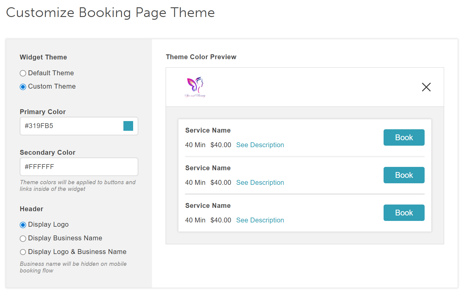 - Scroll down to the "Customize Booking Page Theme" section to adjust widget themes and specify what should be displayed in the header when purchasing a package online