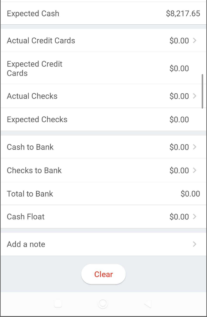 - You can enter the check and/or cash amount that you want to move to your bank account in the Cash to Bank or Check to Bank section