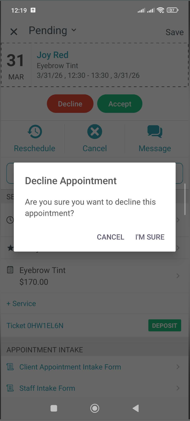 - If you tap on the decline option, a pop-up will appear asking, "Are you sure you want to decline this appointment?" Click on "I'm sure" to proceed with rejecting the appointment. You will then be redirected to the schedule, where the appointment is cancelled and removed from the schedule. The client will receive a notification of cancellation if the "Appointment Cancellation" template is enabled.
