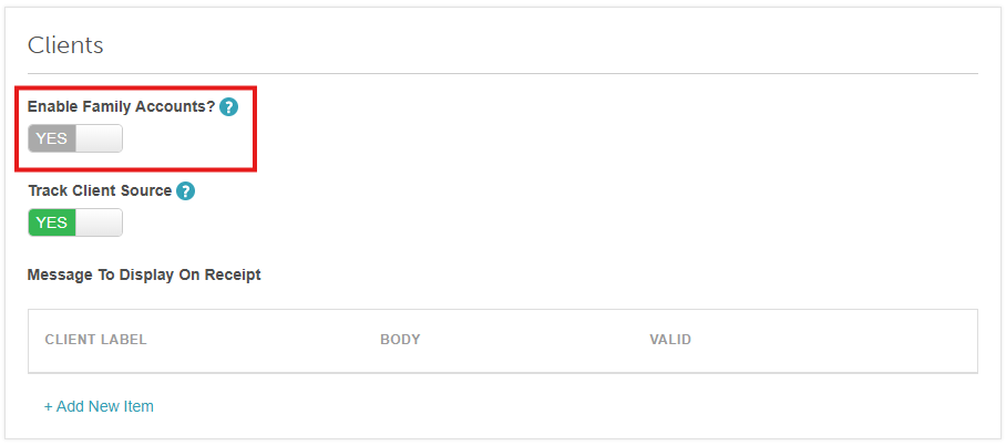 - Scroll to the Clients section and toggle the "Enable Family Accounts?" setting to "Yes"