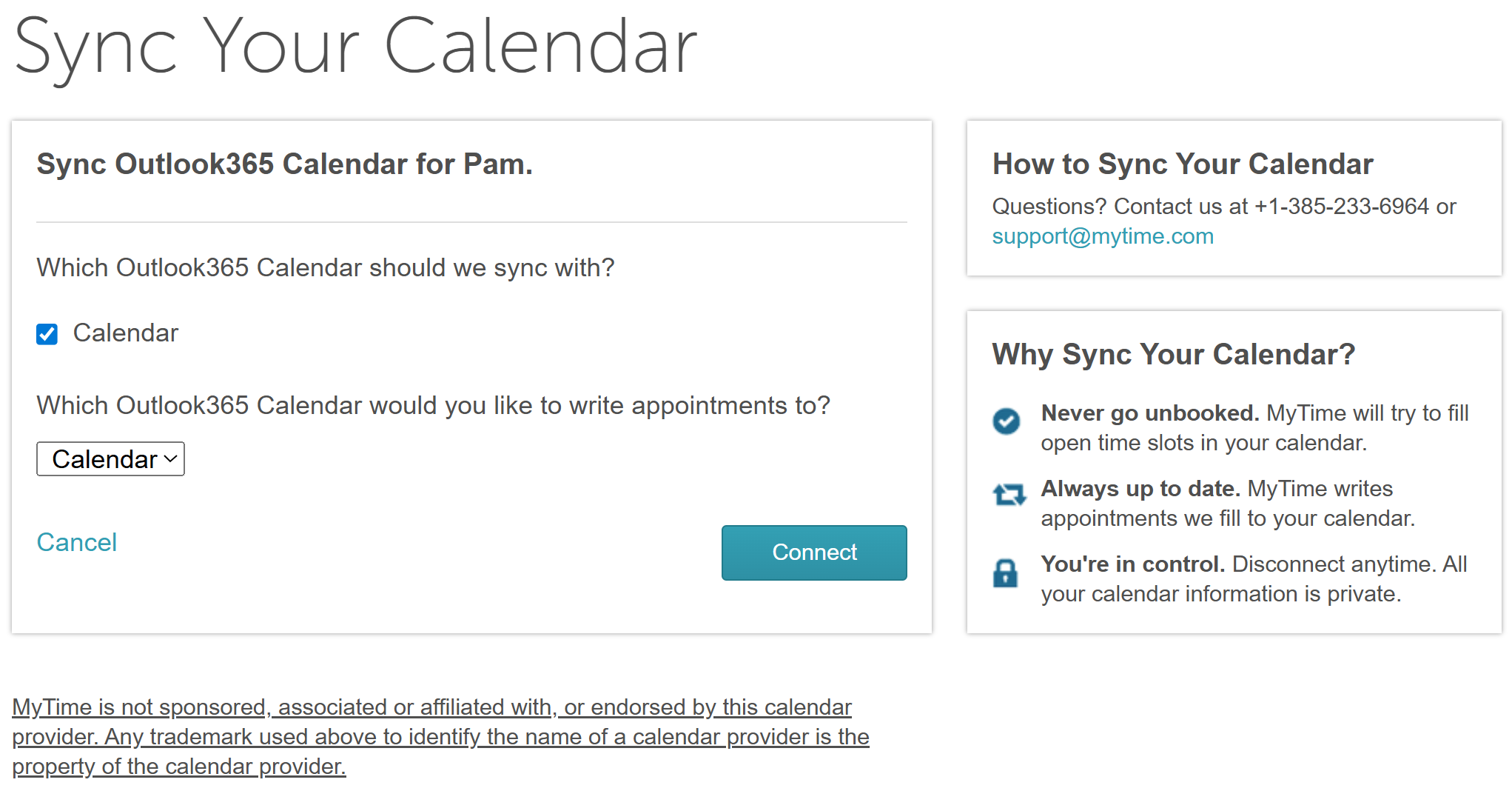 With MyTime, you can sync your Outlook calendar to your Scheduler. This works similarly to the Google Calendar sync integration. The sync happens whenever there's an update on either side. So if an event is added to the Outlook calendar, then sync happens with MyTime. Similarly, if an appointment/event is added to MyTime, then sync with Outlook is triggered.