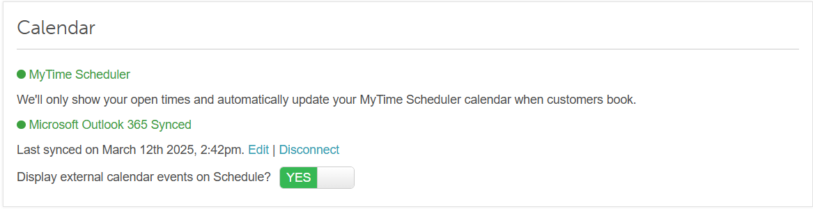 - Confirm that “Display external calendar events on Schedule” is set to Yes.