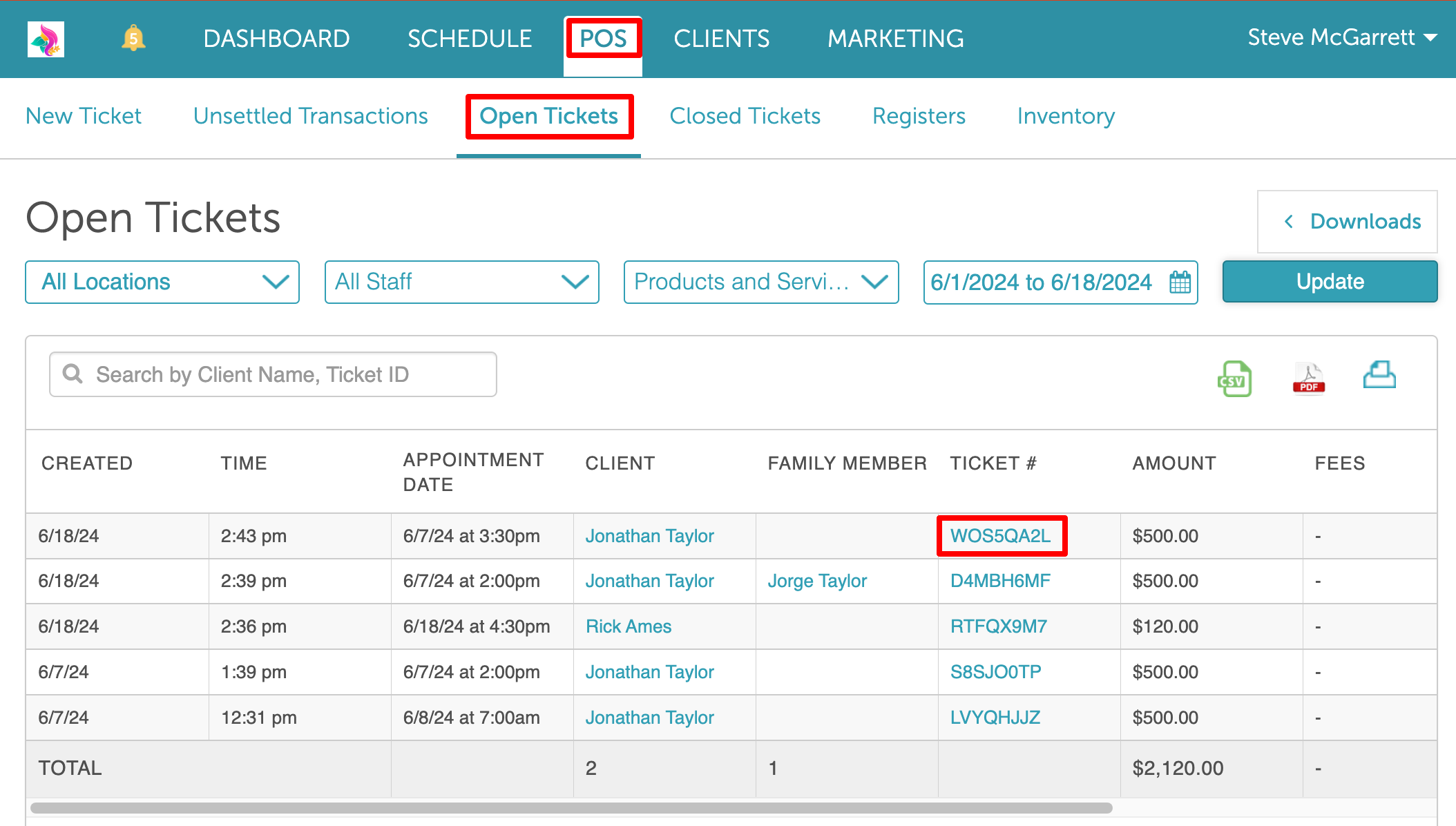 - Click on the Ticket # of the ticket you wish to delete (this can be tickets from appointments, products, etc.)