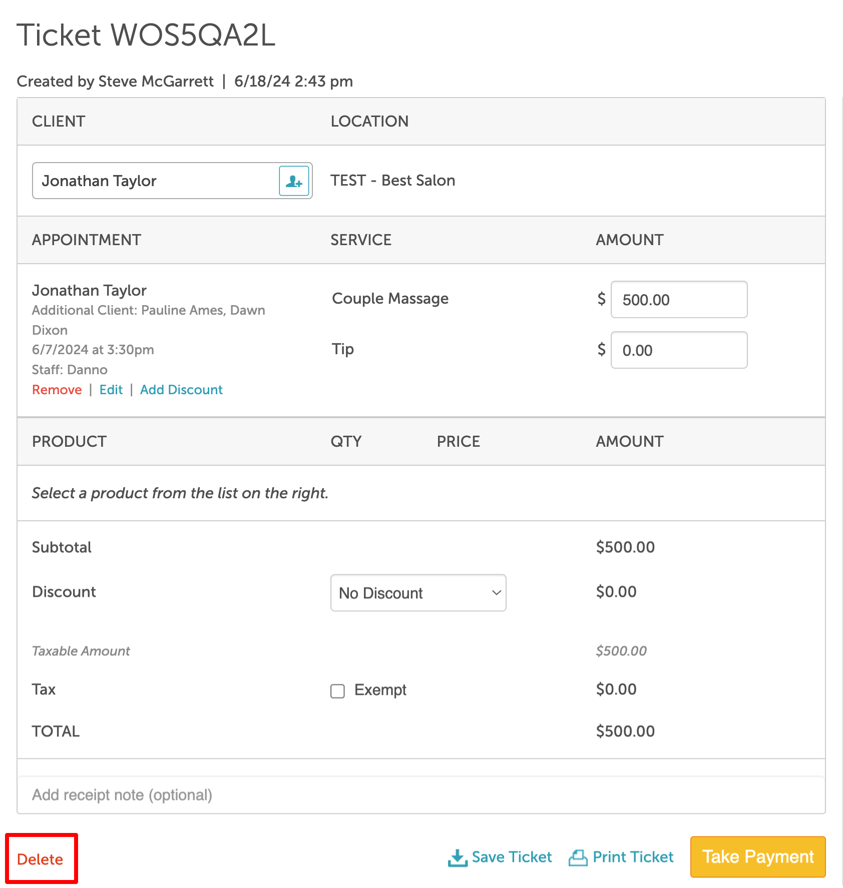 - Open tickets can be deleted as long as no payment has been tendered using a credit card. For example, if a ticket was created for an appointment but no credit card payment was applied, it can be deleted. However, if even a partial credit card payment has been processed, the ticket can no longer be deleted.
